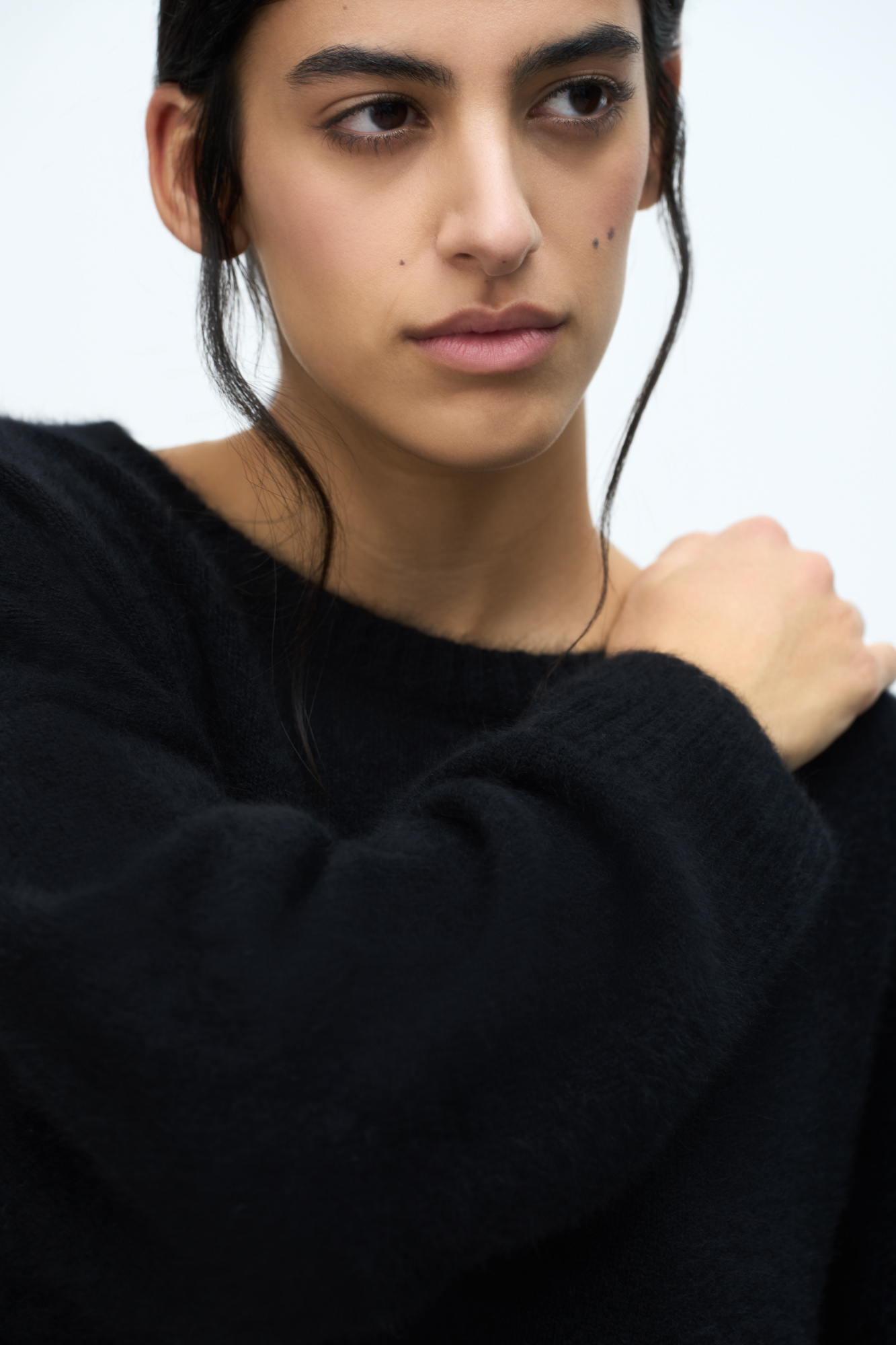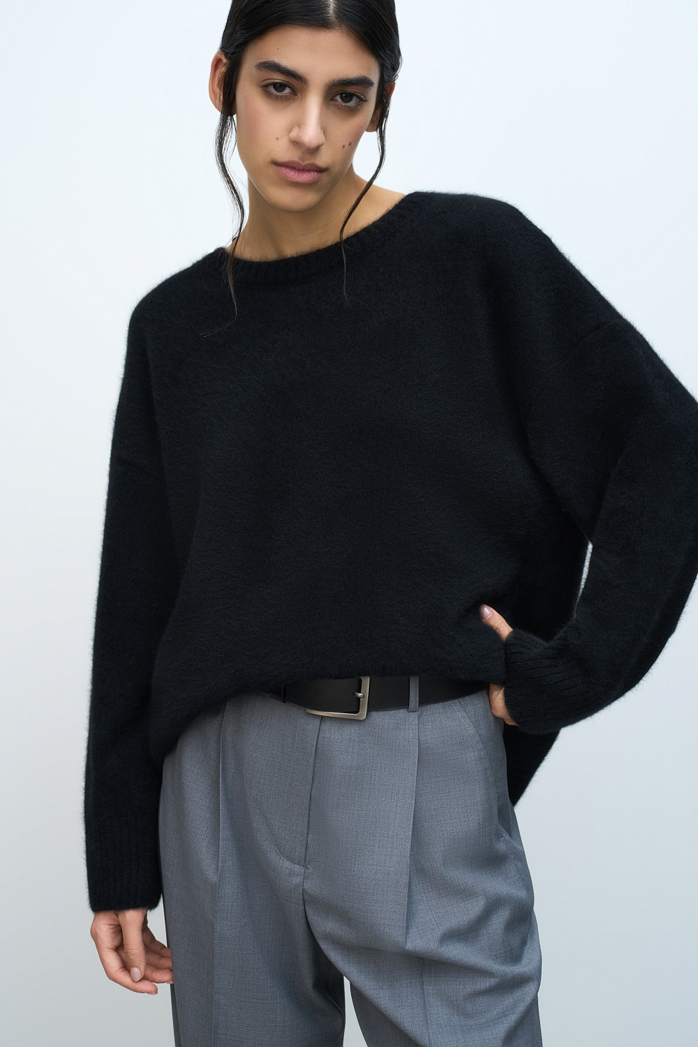 Oversized knit jumper with dropped shoulders and ribbed edges. The yarn contains 70% natural fox down makes the jumper warm and lightweight.