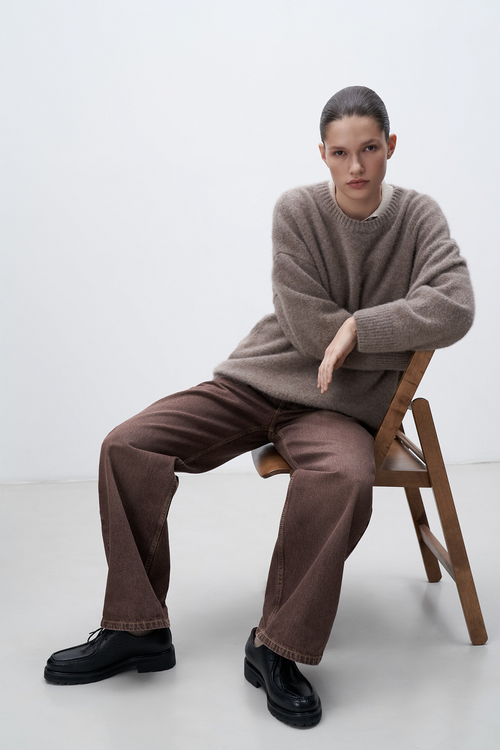 Oversized knit jumper with dropped shoulders and ribbed edges. The yarn contains 70% natural fox down makes the jumper warm and lightweight.