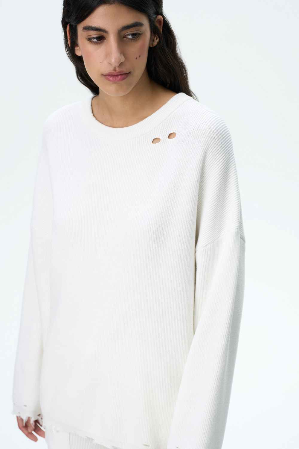 Raw edges knitted jumper. Loose-fit silhouette with dropped shoulders.