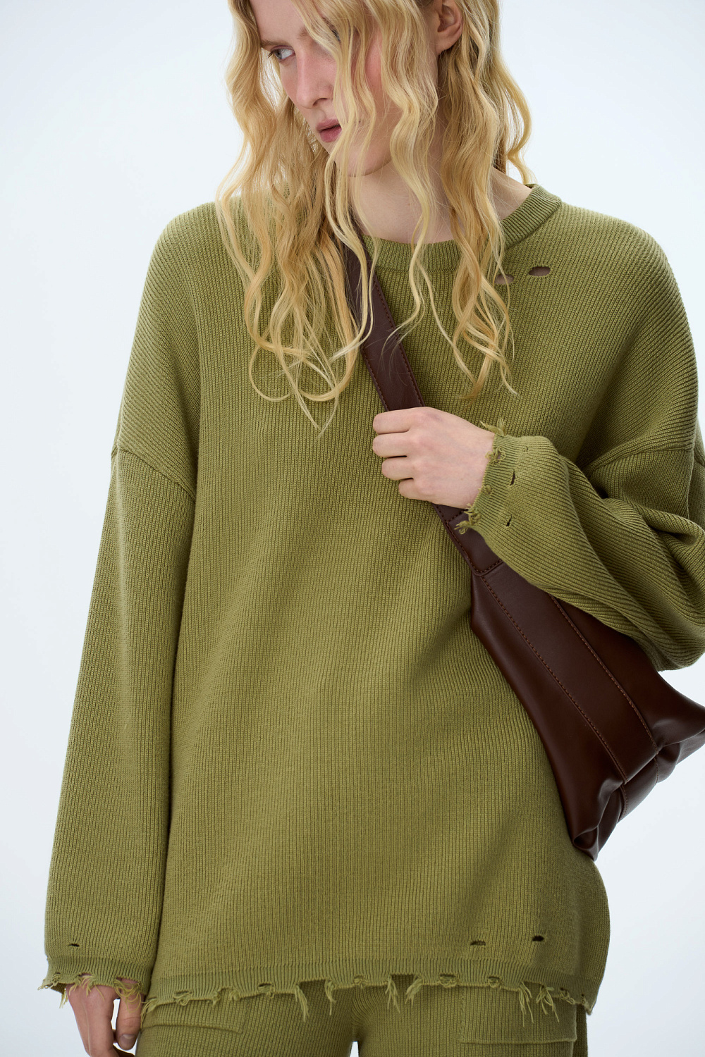 Raw edges knitted jumper. Loose-fit silhouette with dropped shoulders.