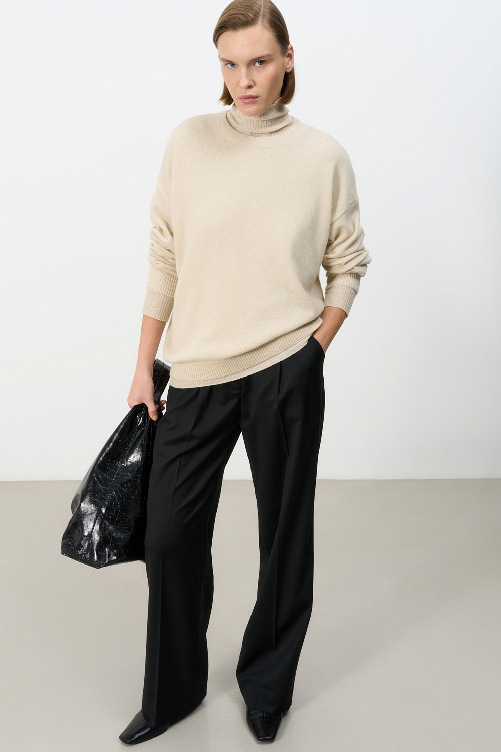Knitted jumper made of 100% cashmere. Relaxed silhouette with dropped shoulders and a rounded hem. The edges of the product are ribbed.