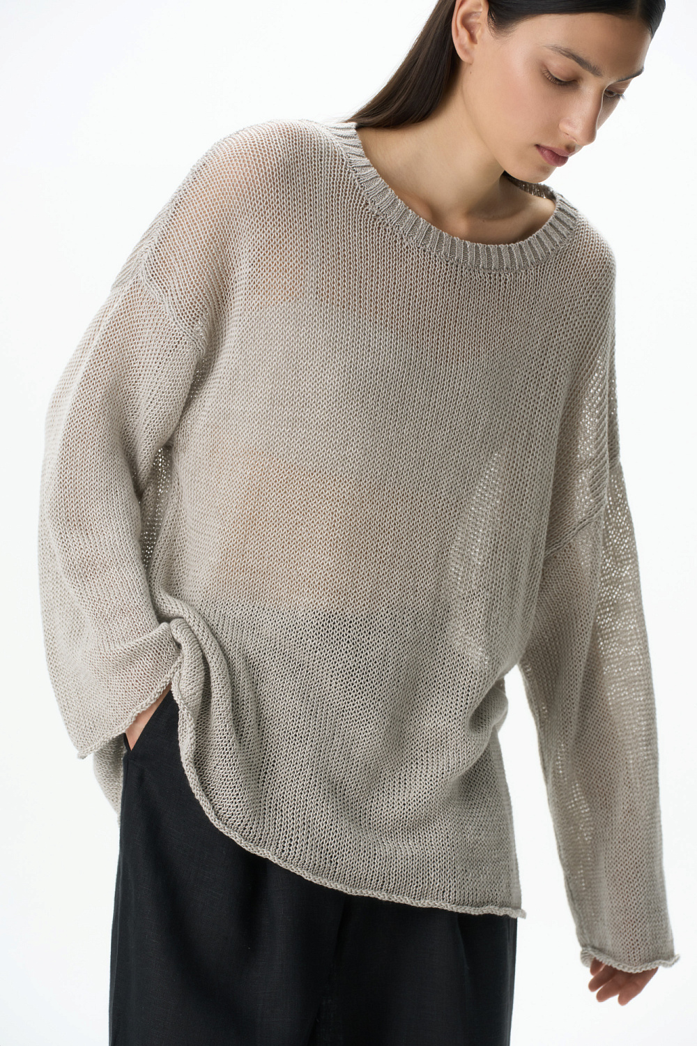 Loose semi-sheer jumper with dropped shoulder line.