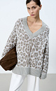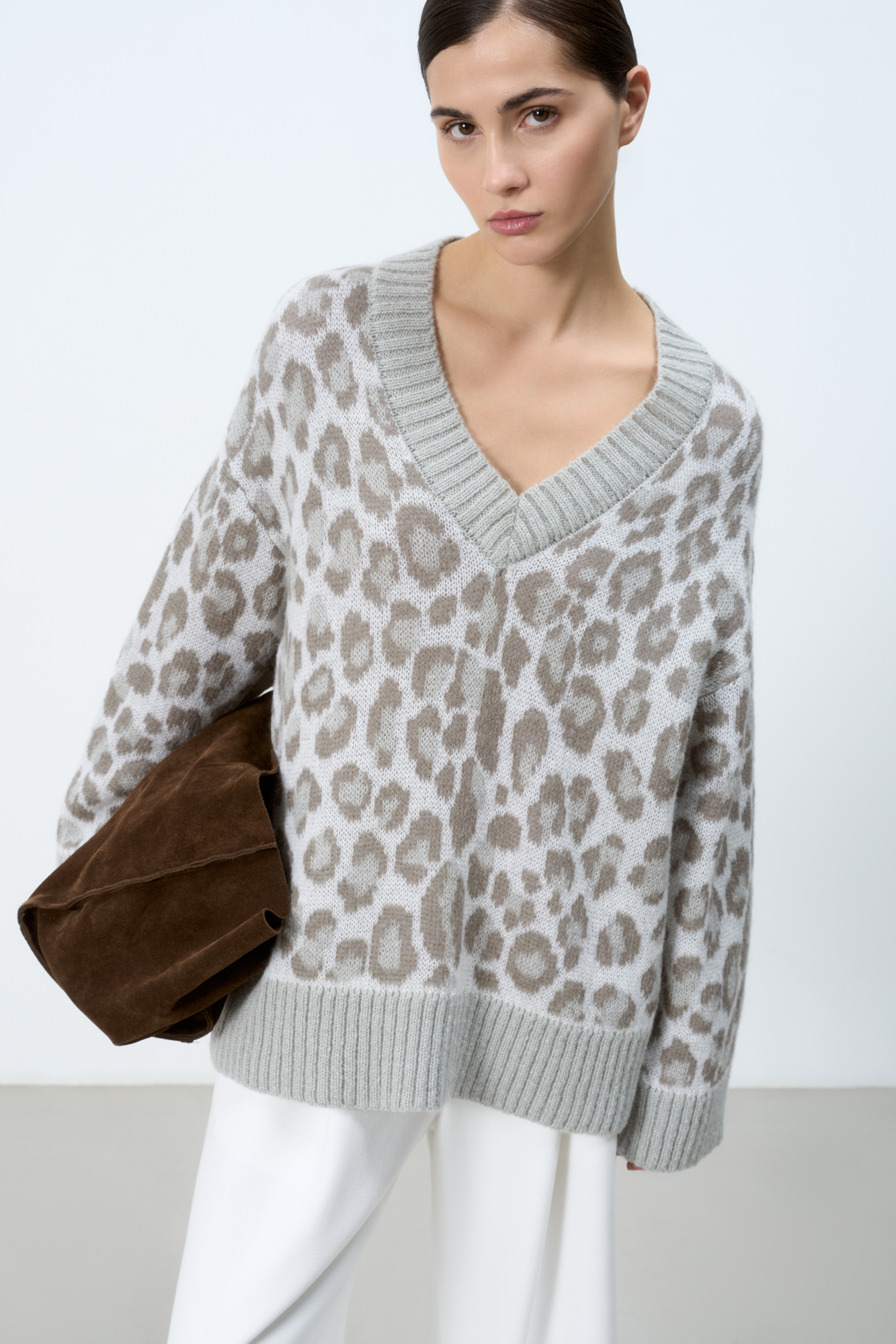 Knitted jumper with jacquard animal print. The model has a loose silhouette with dropped shoulders and a V-shaped neckline. The edges of the product are ribbed.