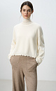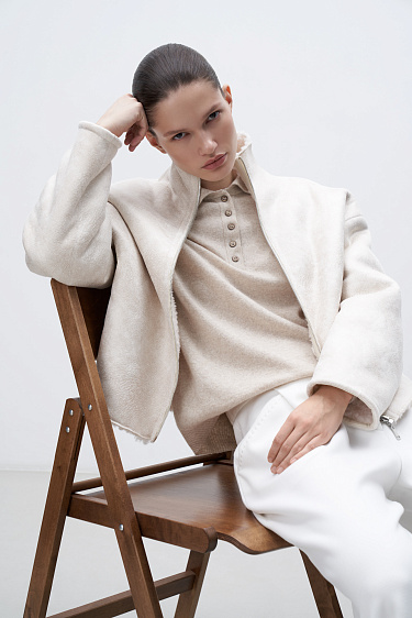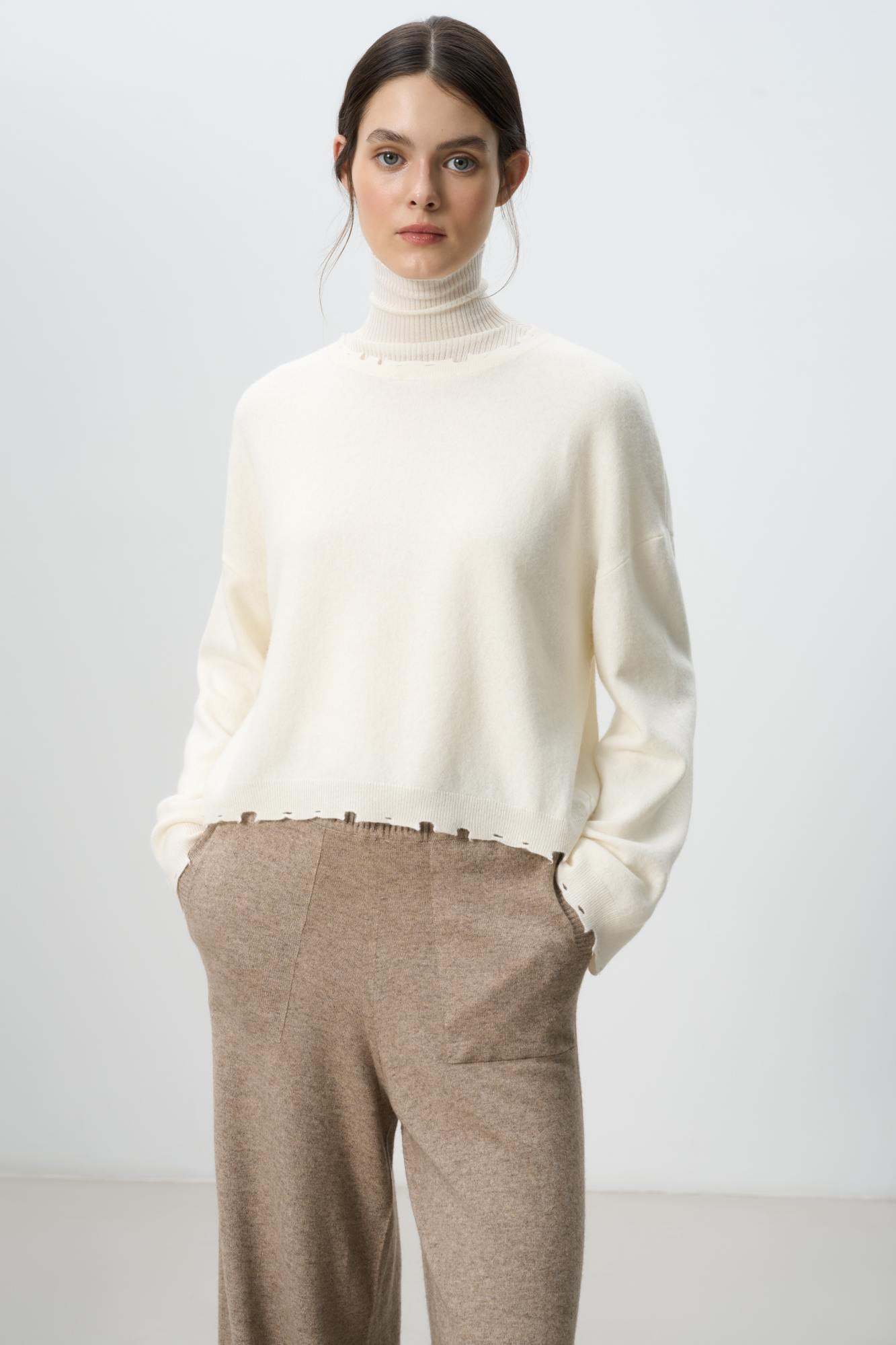 Cropped knitted jumper made of wool and cashmere. Loose silhouette model with dropped shoulder line. The neckline, sleeve cuffs and bottom of the product are made with fraying.