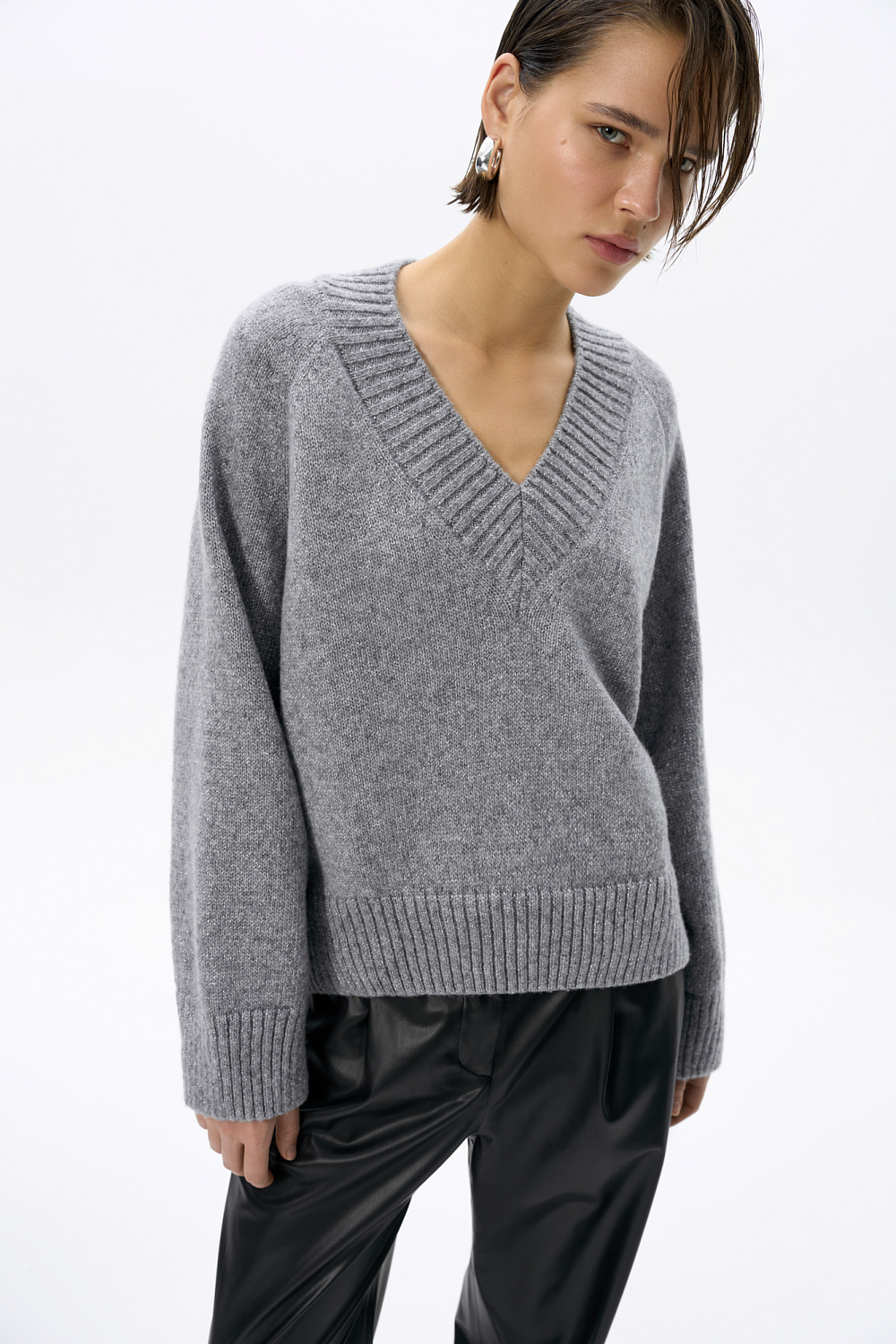Knitted jumper made of merino wool with lurex. Loose silhouette model with V-neck.