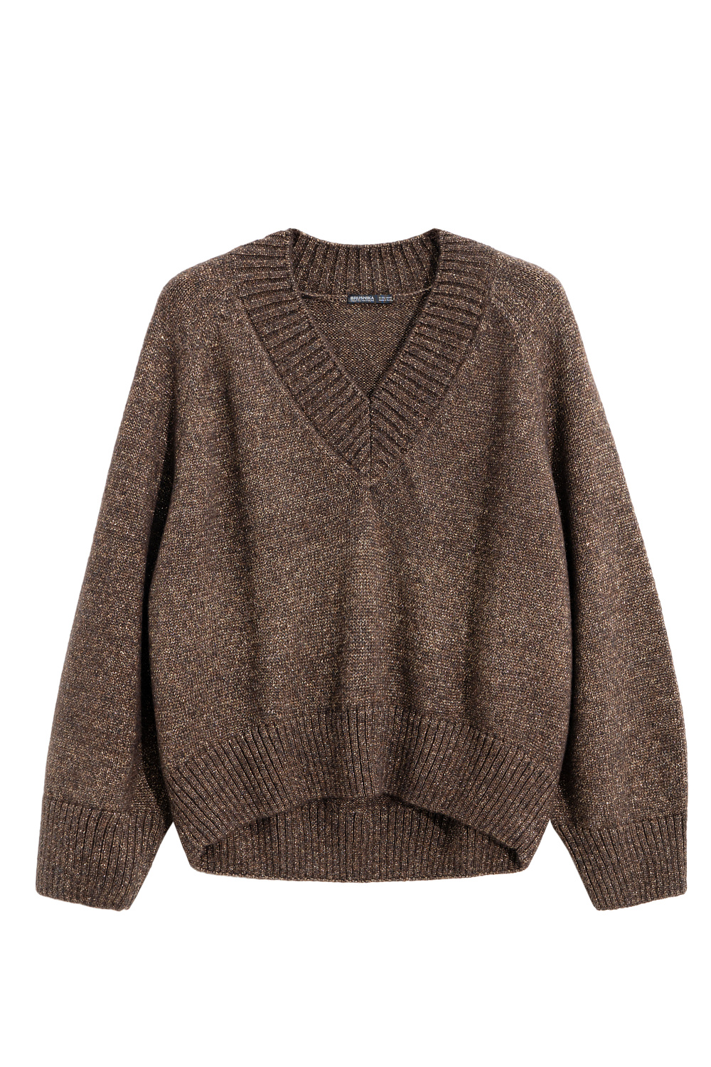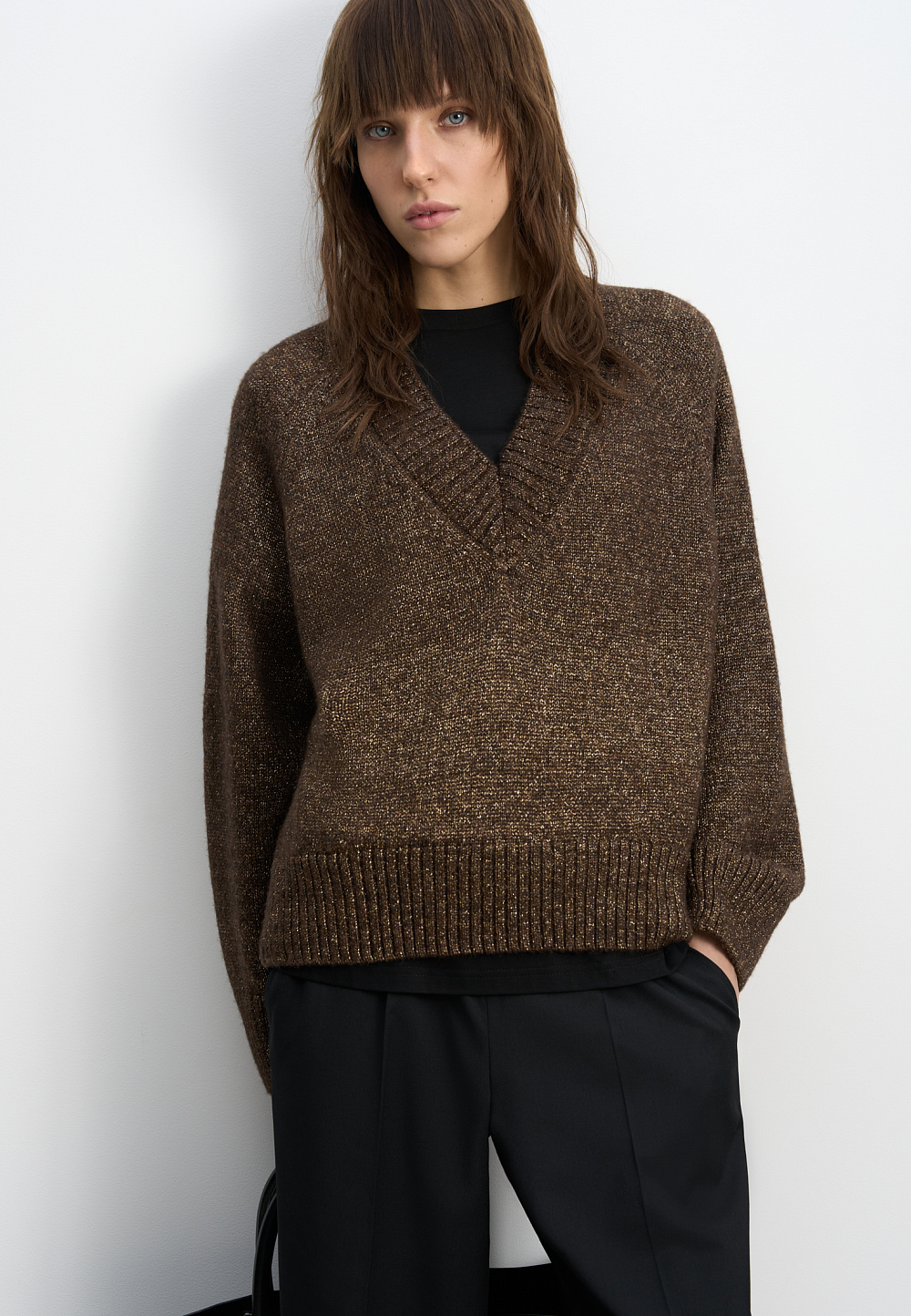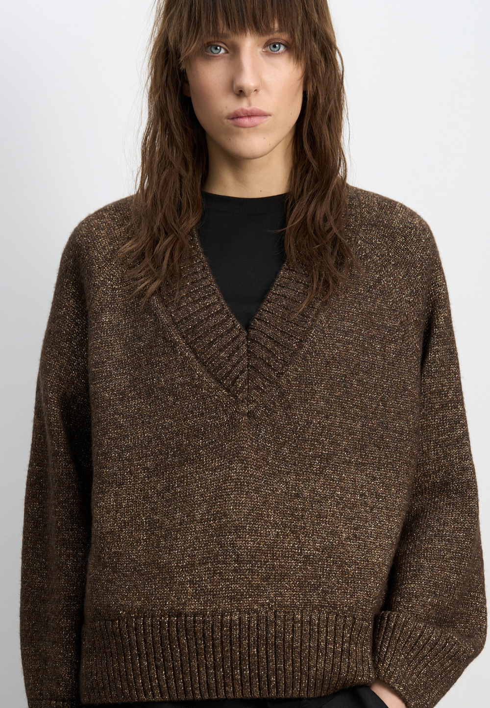Knitted jumper made of merino wool with lurex. Loose silhouette model with V-neck.