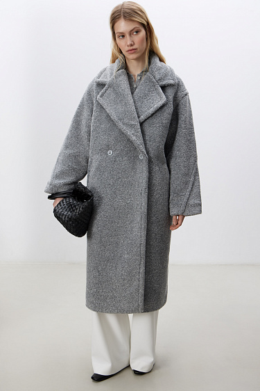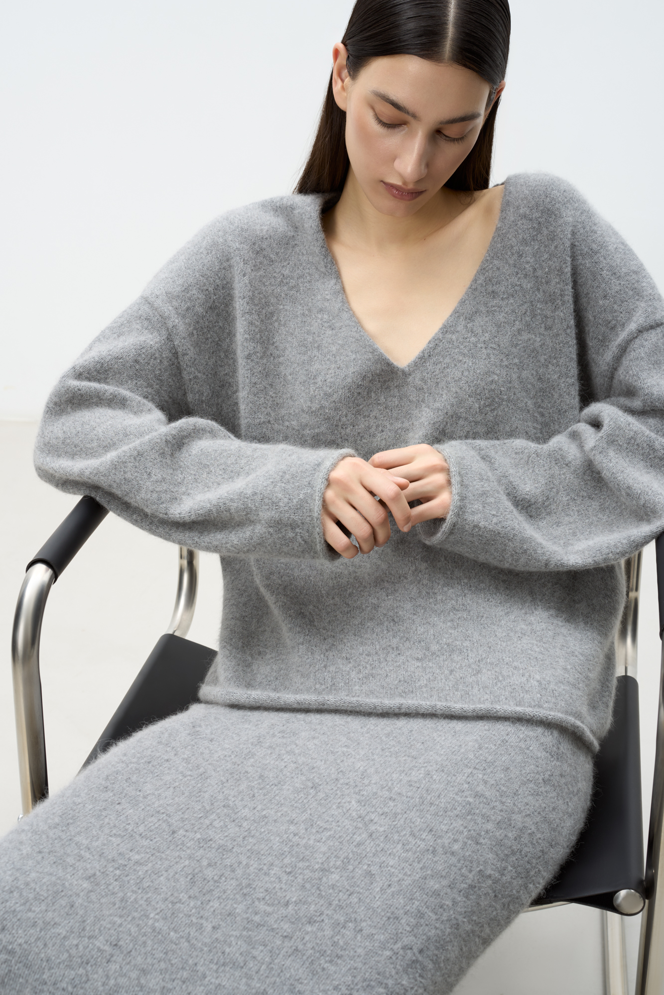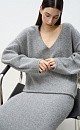 Oversized knitted jumper made from fox down. Model with a deep V-neck, dropped shoulders, long wide sleeves and rolls at the hem. You can complement the look with a skirt.