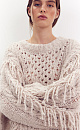 Merino wool knitted jumper in boho style. Loose silhouette model with dropped shoulders and a round neckline. The product is decorated with large knitted braids and long fringe.