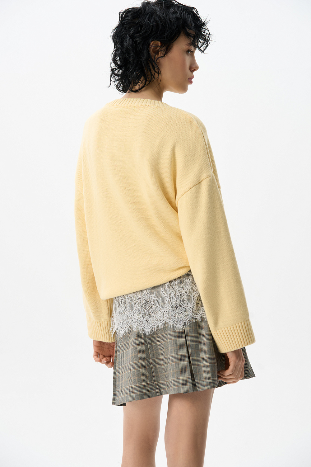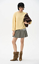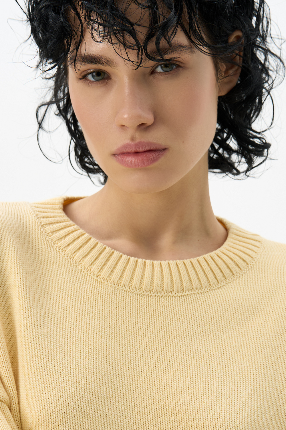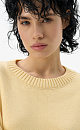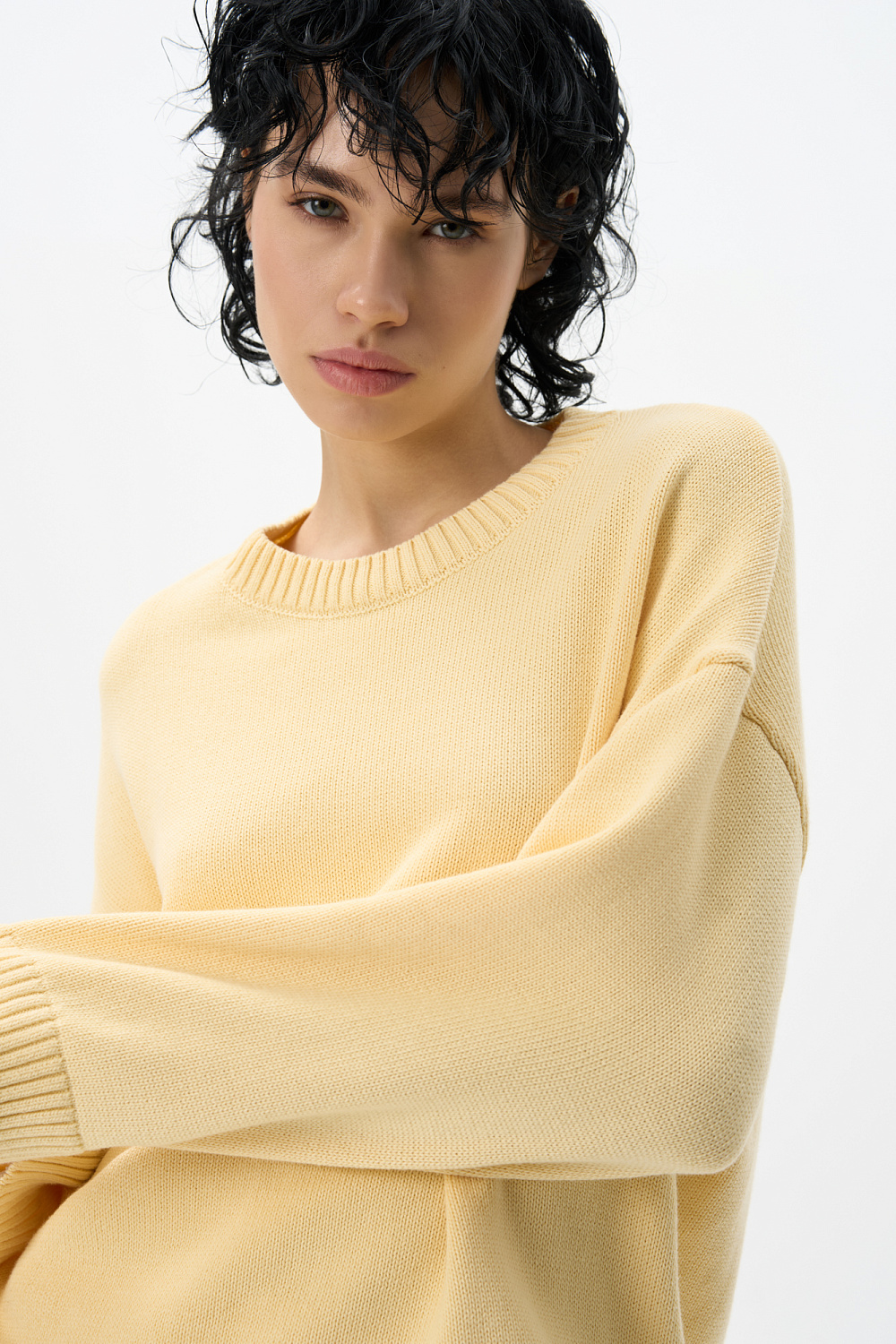 Knitted jumper made of 100% cotton. Loose silhouette model with dropped shoulders and a round neckline. The edges of the product are ribbed. You can complement the look with a skirt.