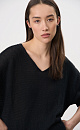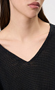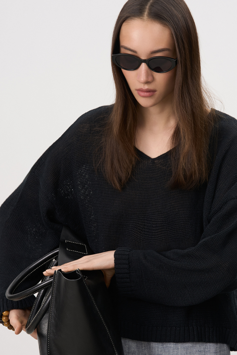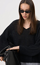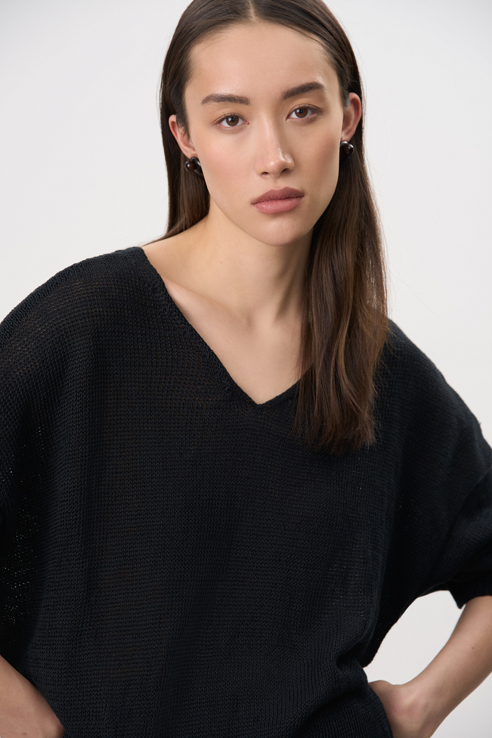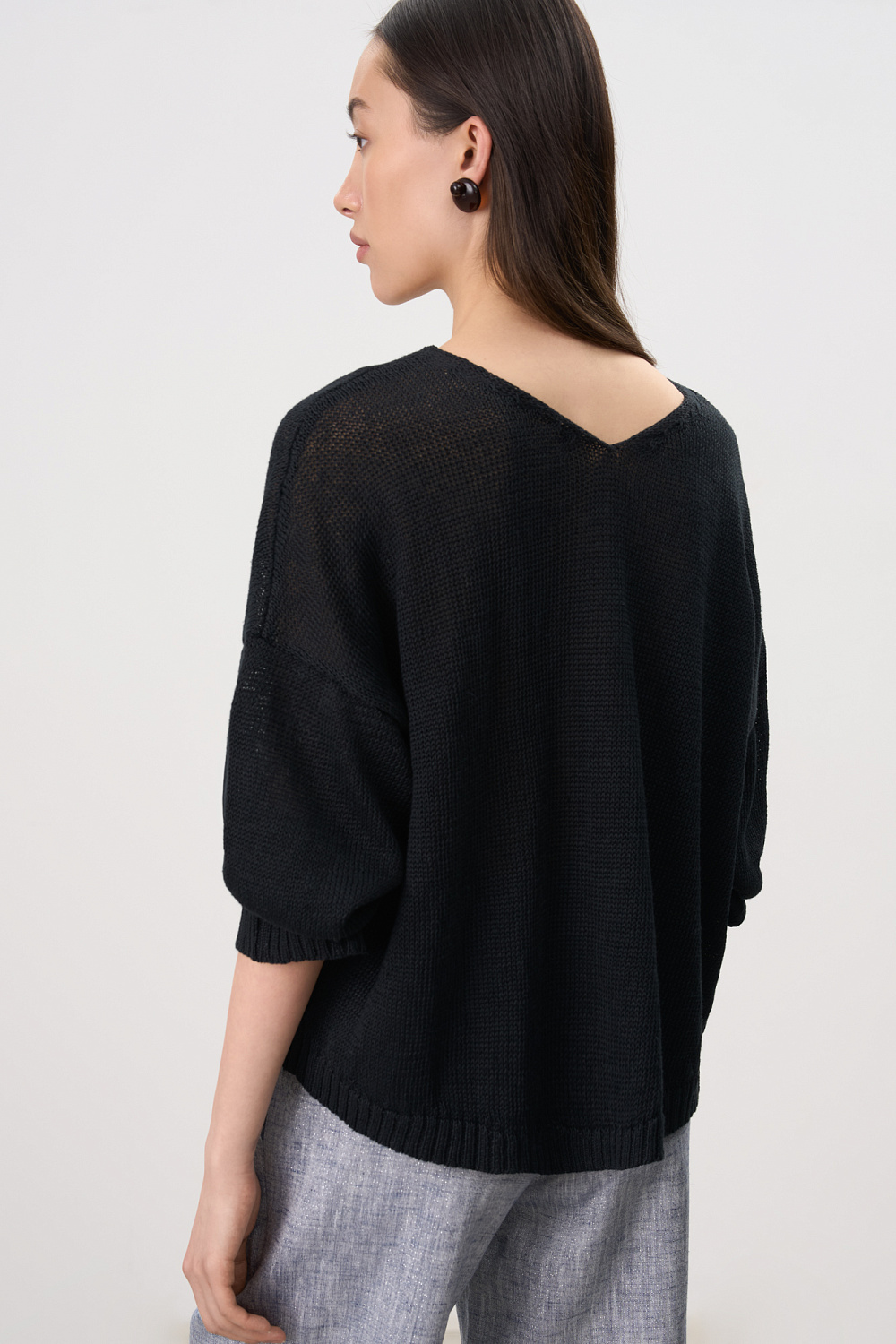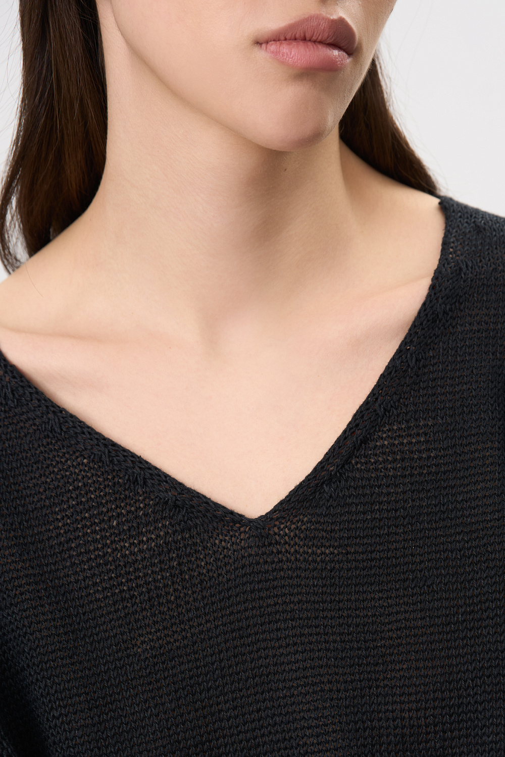 Knitted jumper made of 100% linen with a V-neck. Model of a straight silhouette with long sleeves and an elongated back. The edges of the product are ribbed.