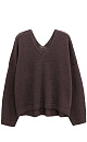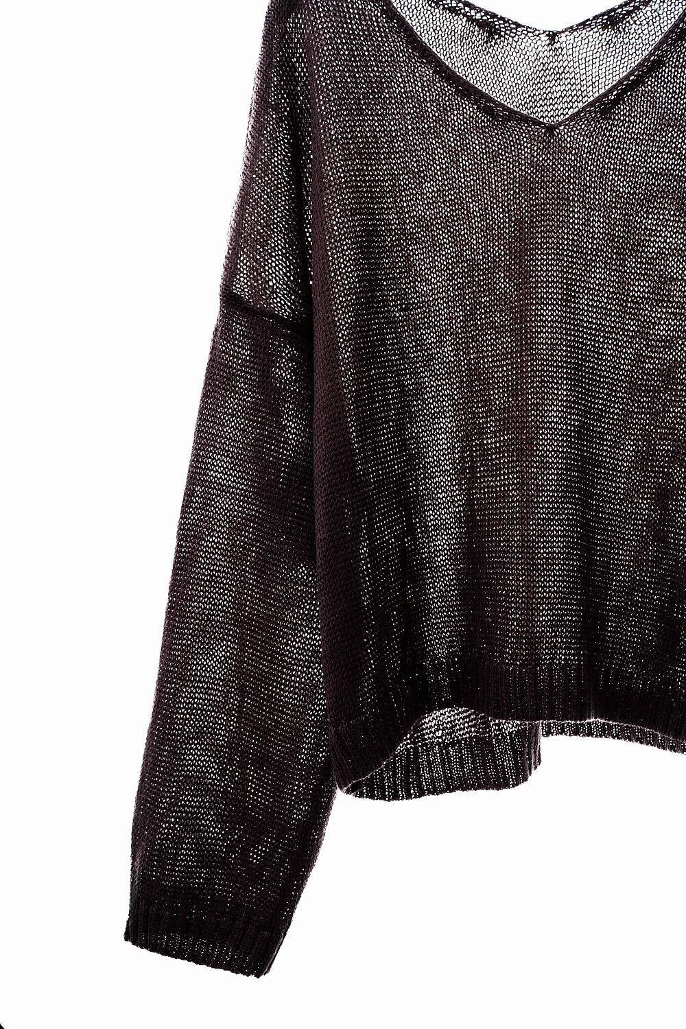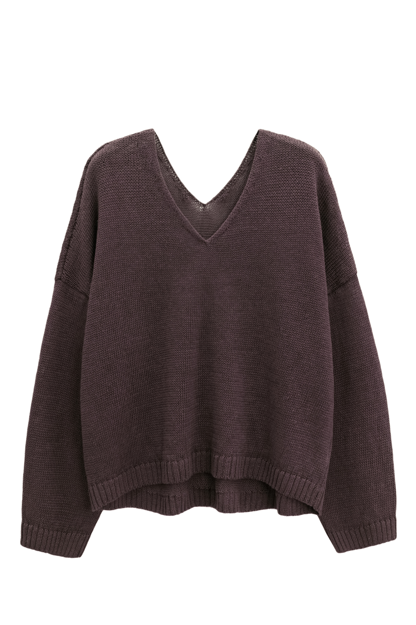 Knitted jumper made of 100% linen with a V-neck. Model of a straight silhouette with long sleeves and an elongated back. The edges of the product are ribbed.