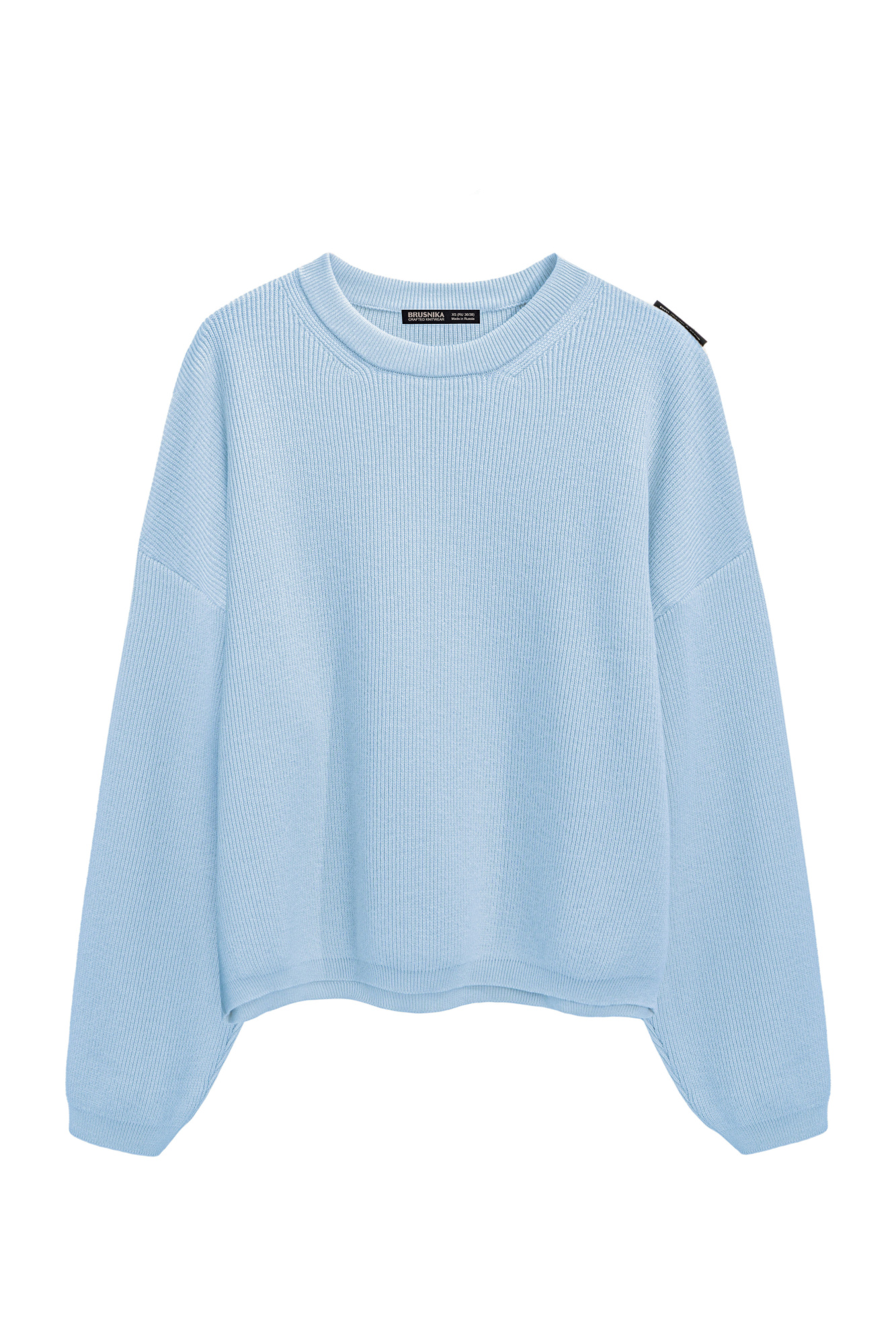 Short knitted jumper made of cotton with added viscose. Loose fit model with dropped shoulders and a round neckline.
