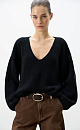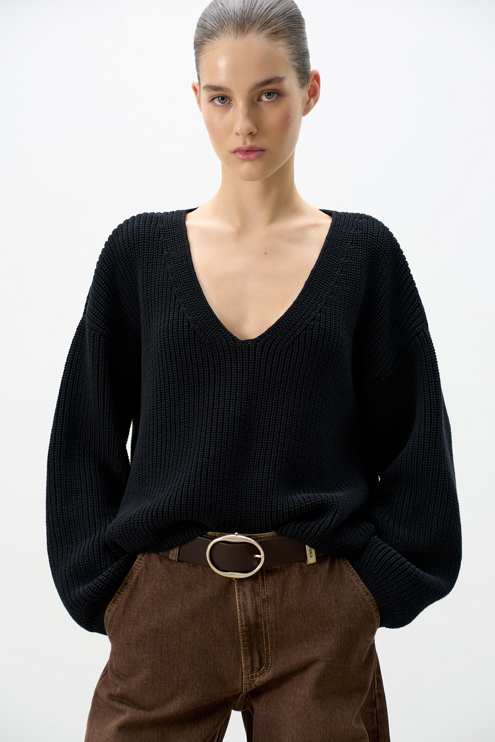 Knitted jumper made of cotton with added elastane. Loose silhouette model with a V-neckline and dropped shoulders.
