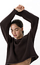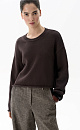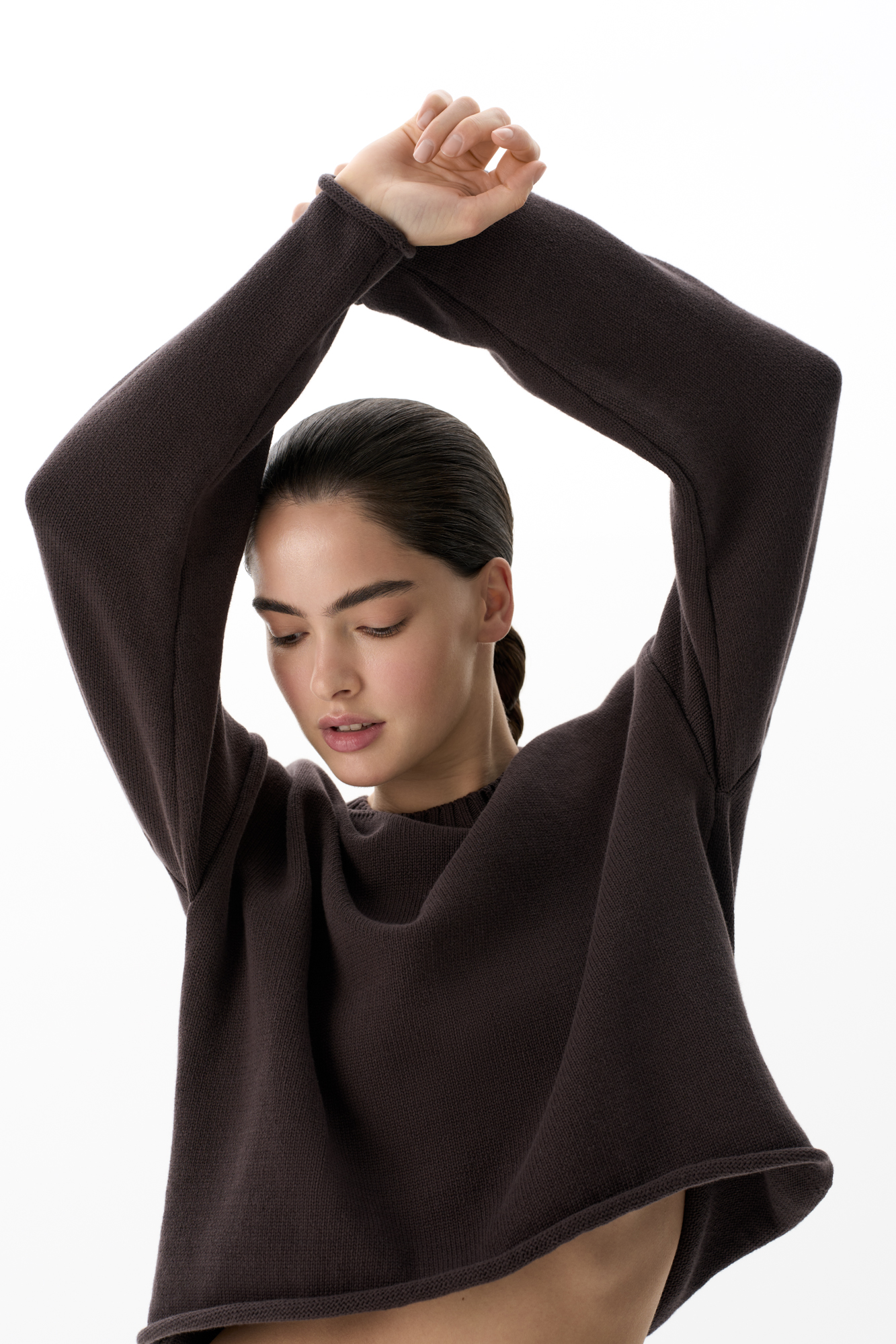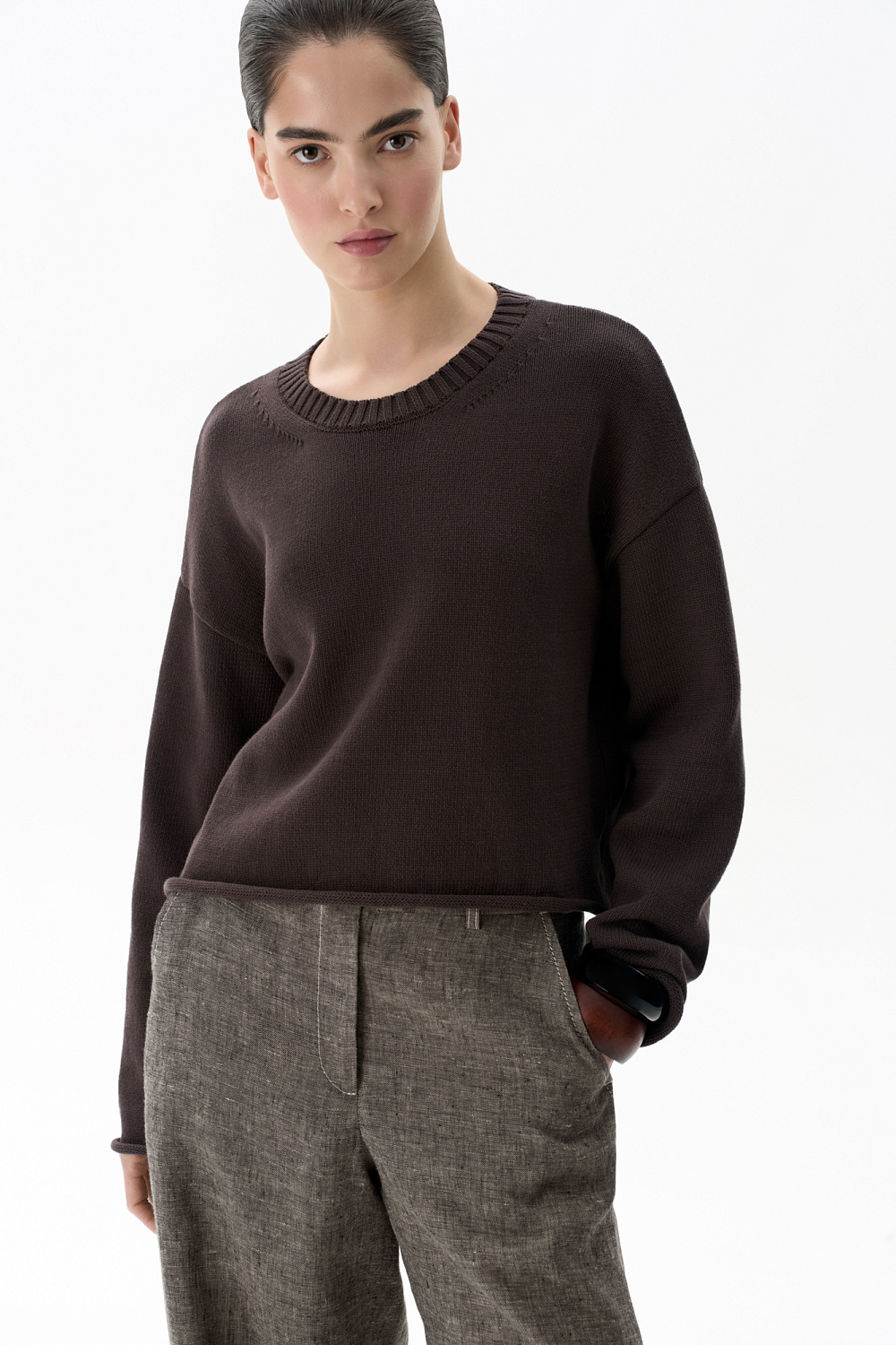 Knitted jumper made of cotton with added elastane. The model has a loose silhouette with dropped shoulders and a round neckline. The product is decorated with rolls along the bottom and on the cuffs of the sleeves.