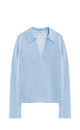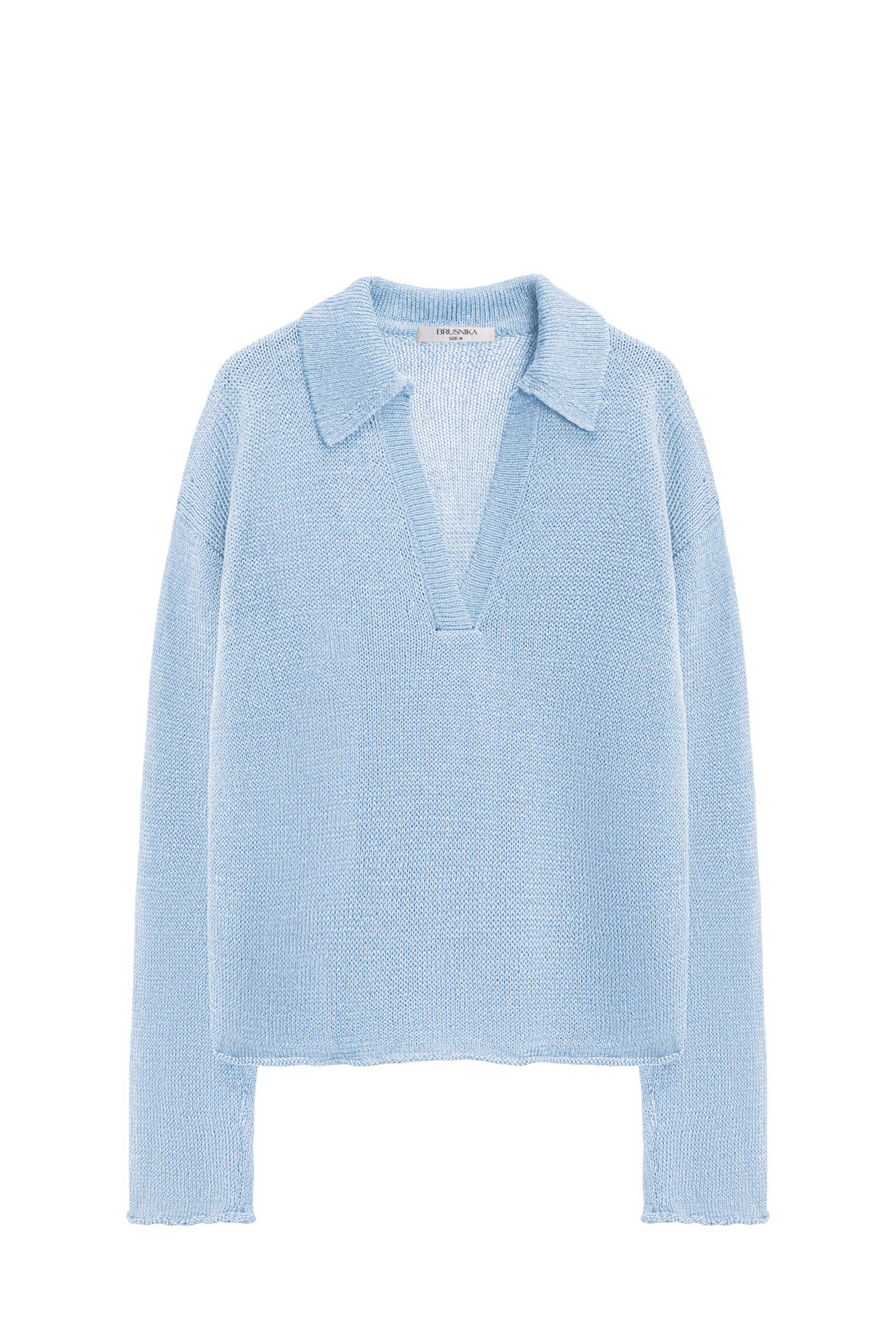 Knitted jumper made of 100% linen with a polo collar. The model has a loose silhouette, with dropped shoulders, long sleeves, a V-neck and rolls along the bottom edge of the product.