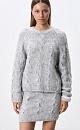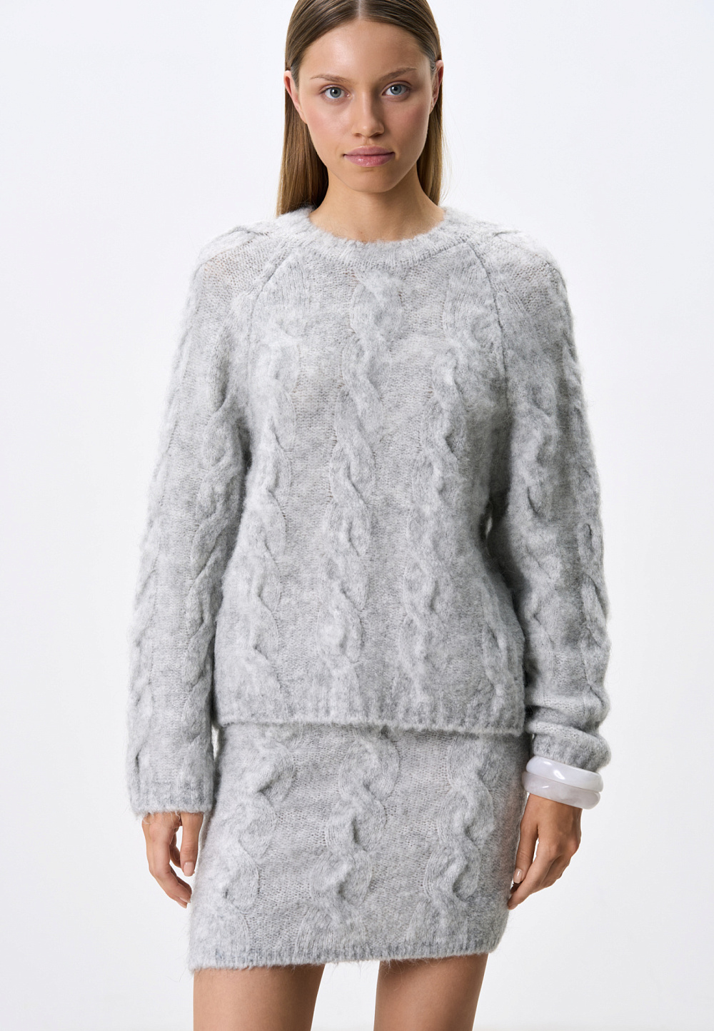 Knitted jumper made of wool and mohair. The model has a loose silhouette with dropped shoulders, voluminous sleeves and a round neckline. The product is decorated with textured knitting in the form of braids. The edges are ribbed.