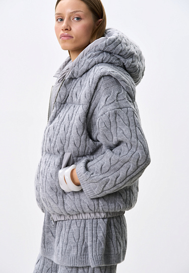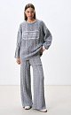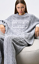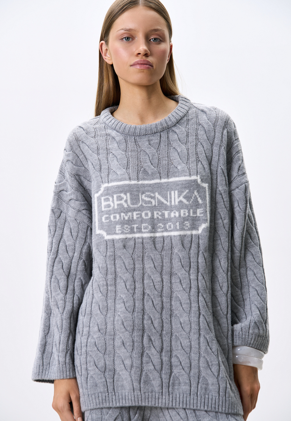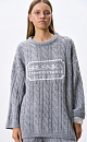 Knitted jumper with voluminous braids made of soft wool. The model has a loose silhouette, with dropped shoulders and a round neckline. The product is decorated with branded jacquard on the chest. You can complement the look with trousers and a skirt in the same style.