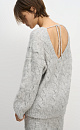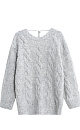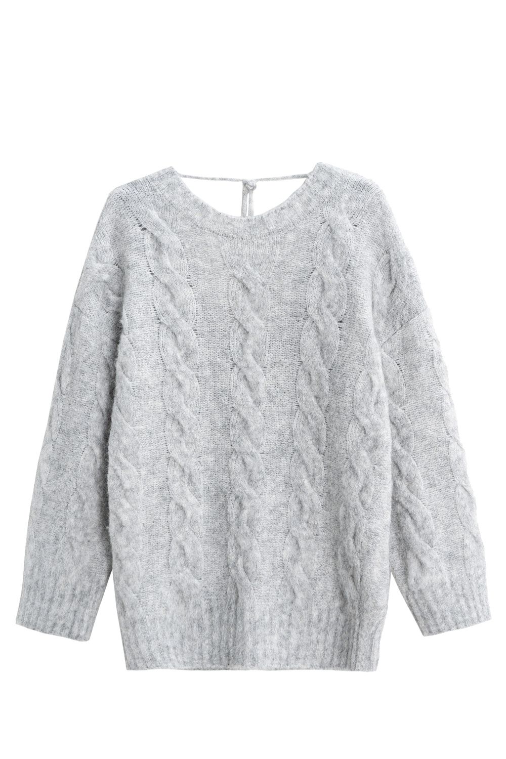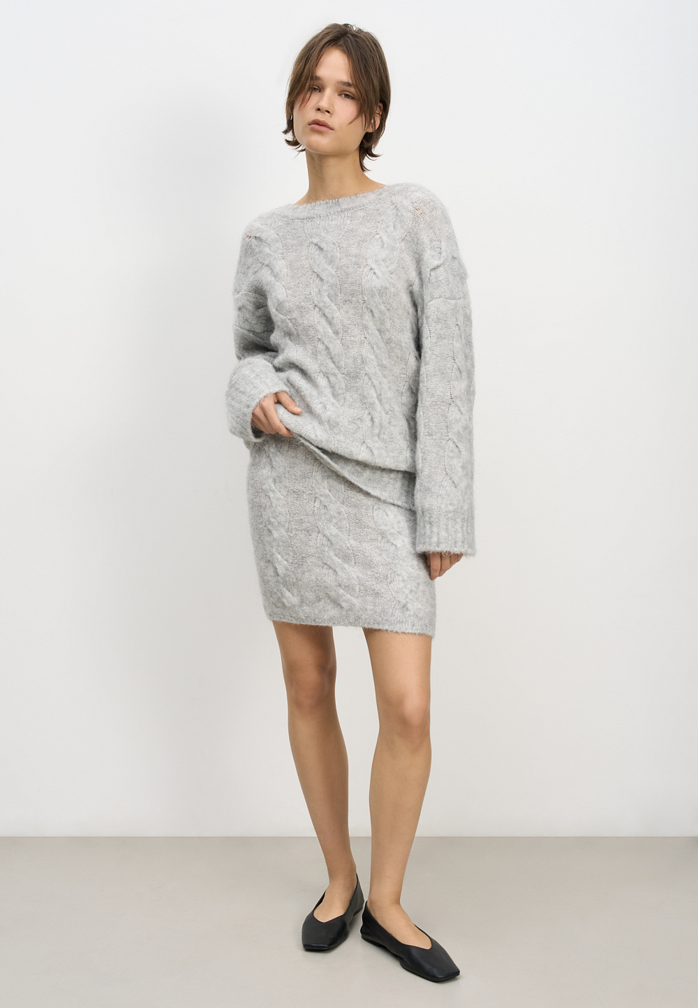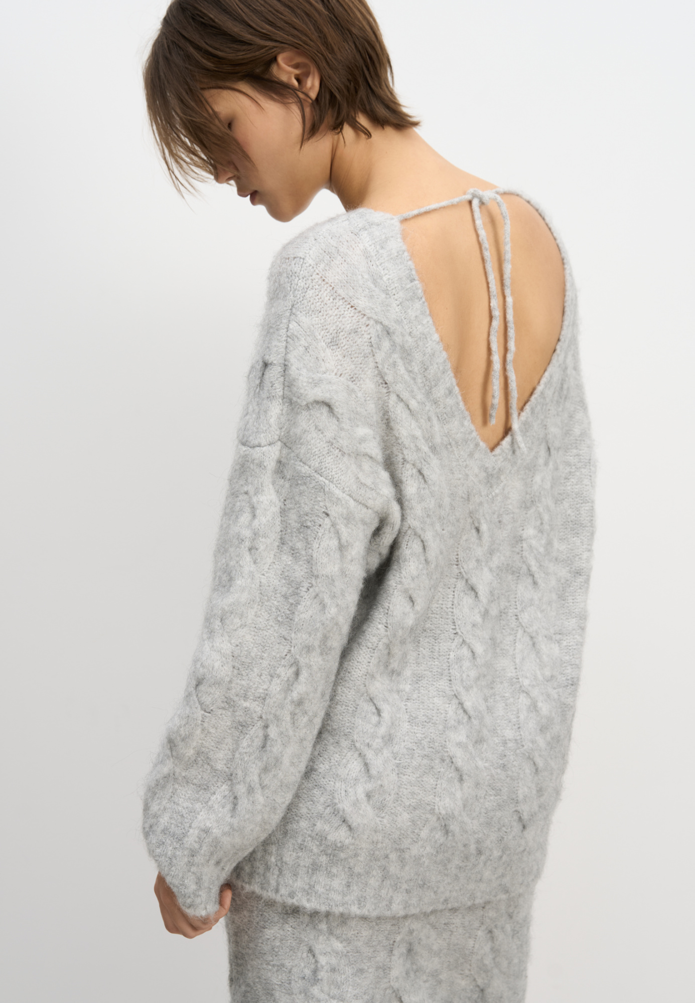 Knitted jumper made of wool and mohair. The model has a loose silhouette with dropped shoulders, long sleeves, a round neckline and a deep cutout at the back, secured with a drawstring. The product is decorated with textured knitting in the form of braids. The edges of the product are ribbed.