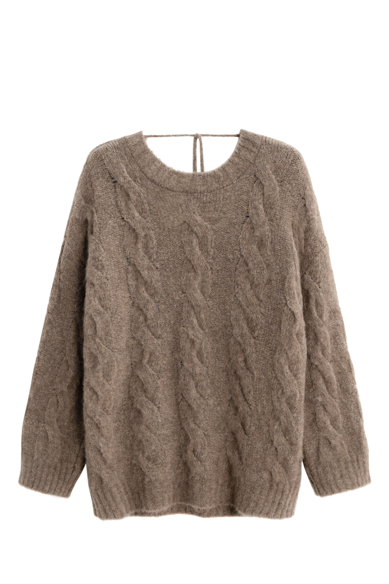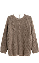 Knitted jumper made of wool and mohair. The model has a loose silhouette with dropped shoulders, long sleeves, a round neckline and a deep cutout at the back, secured with a drawstring. The product is decorated with textured knitting in the form of braids. The edges of the product are ribbed.