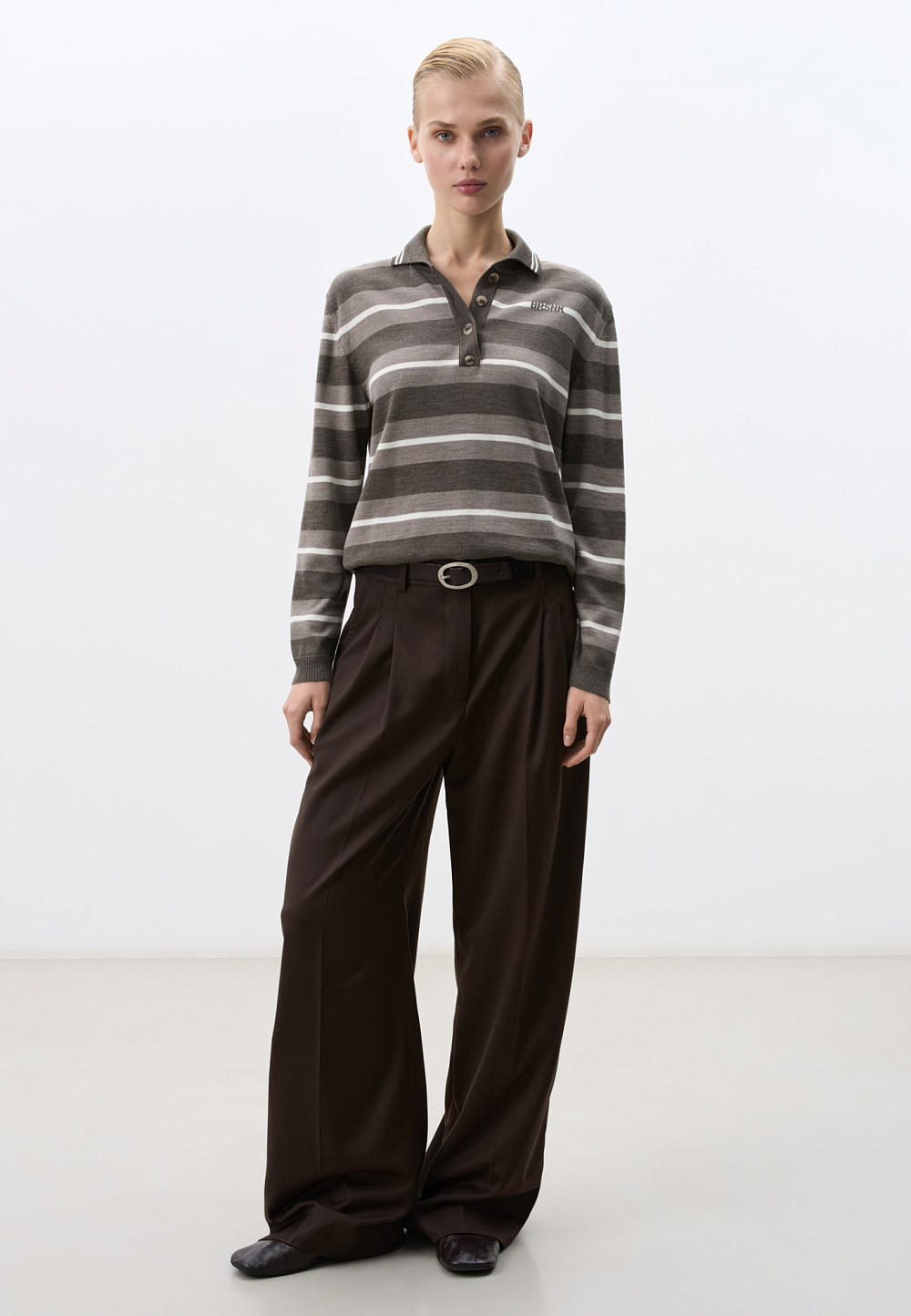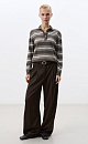Striped wool knitted jumper. The model has a loose silhouette, long sleeves, a polo collar with buttons and a branded jacquard on the chest. The cuffs, collar and hem of the product are ribbed.