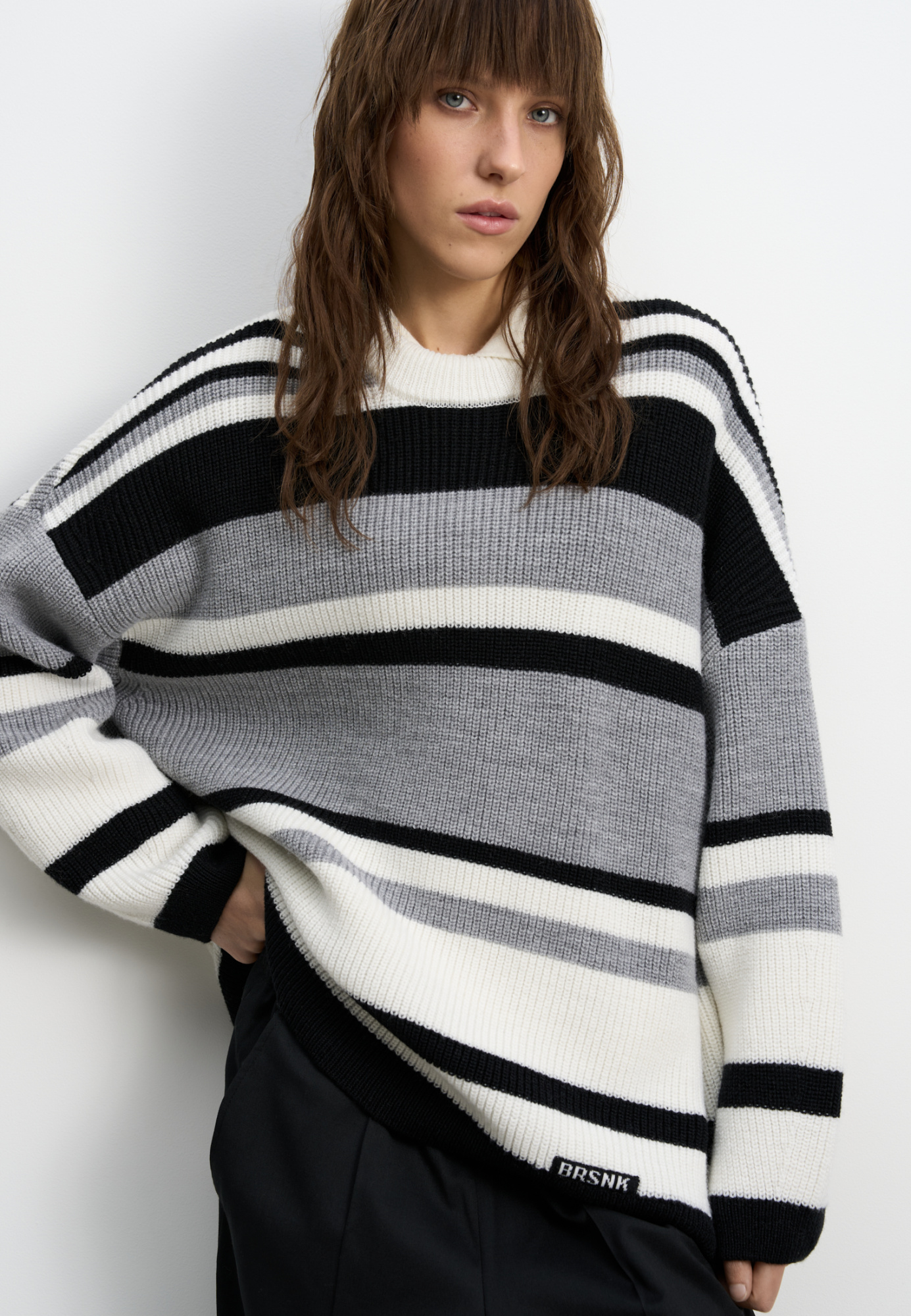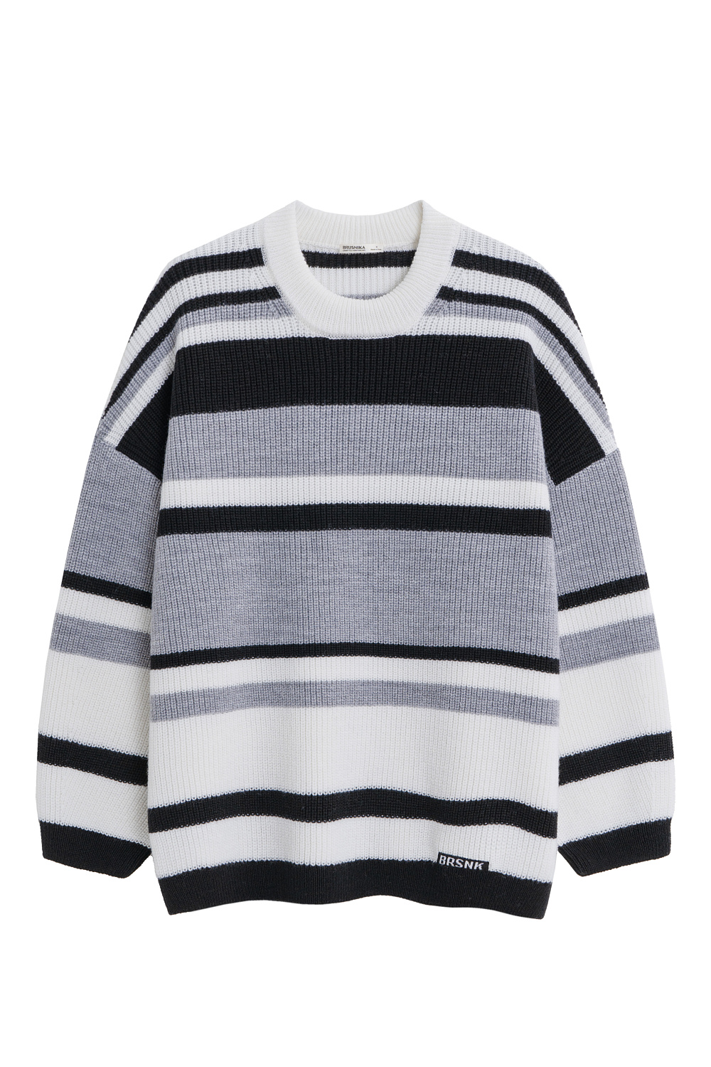 Striped wool knitted jumper. The model has a loose silhouette, with dropped shoulders, long sleeves and a round neckline. The product is decorated with a sewn-on brand logo.