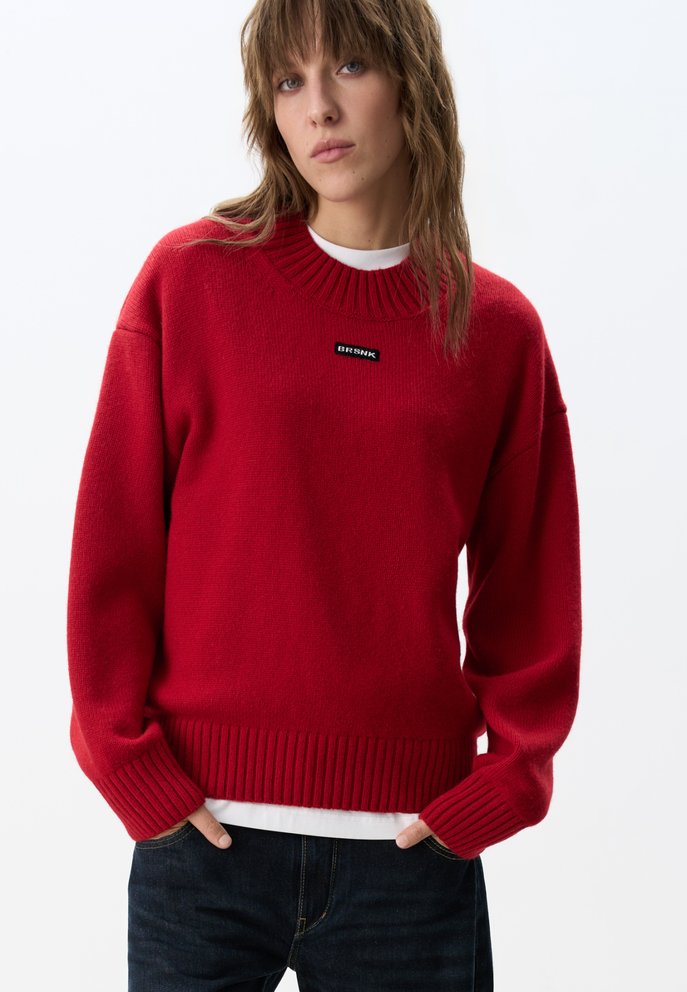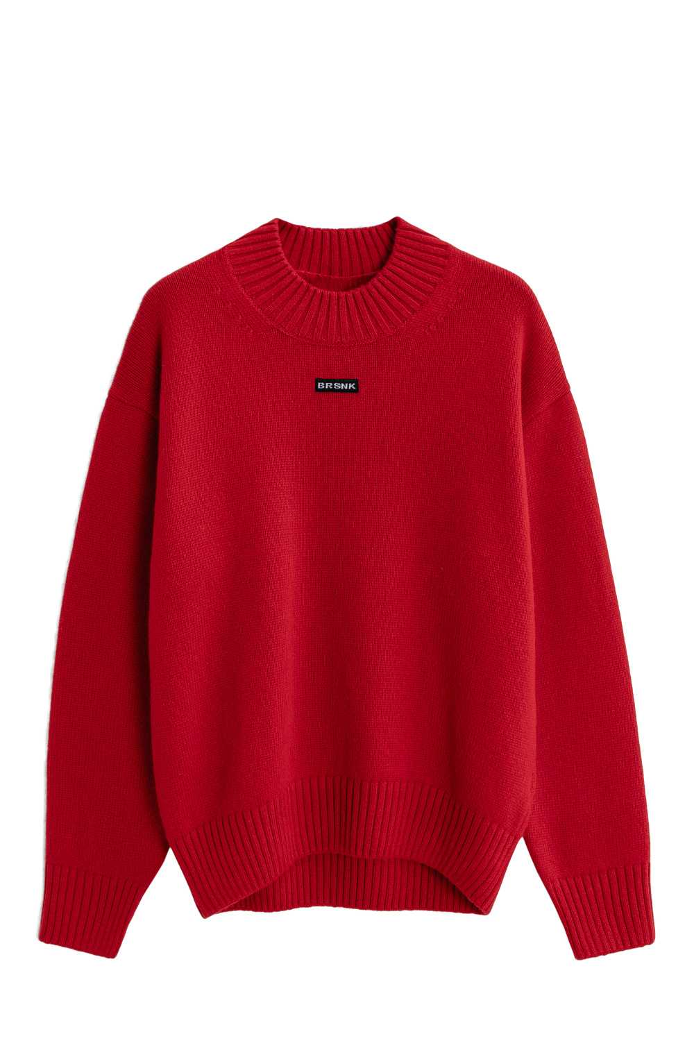 Voluminous jumper made of wool with the addition of cashmere. Loose silhouette model with dropped shoulders. The collar is made with purl loops in a wide rib. The cuffs of the sleeves and the bottom of the product are with elastic. The jumper is decorated with a branded knitted label.