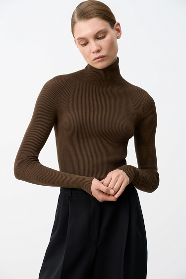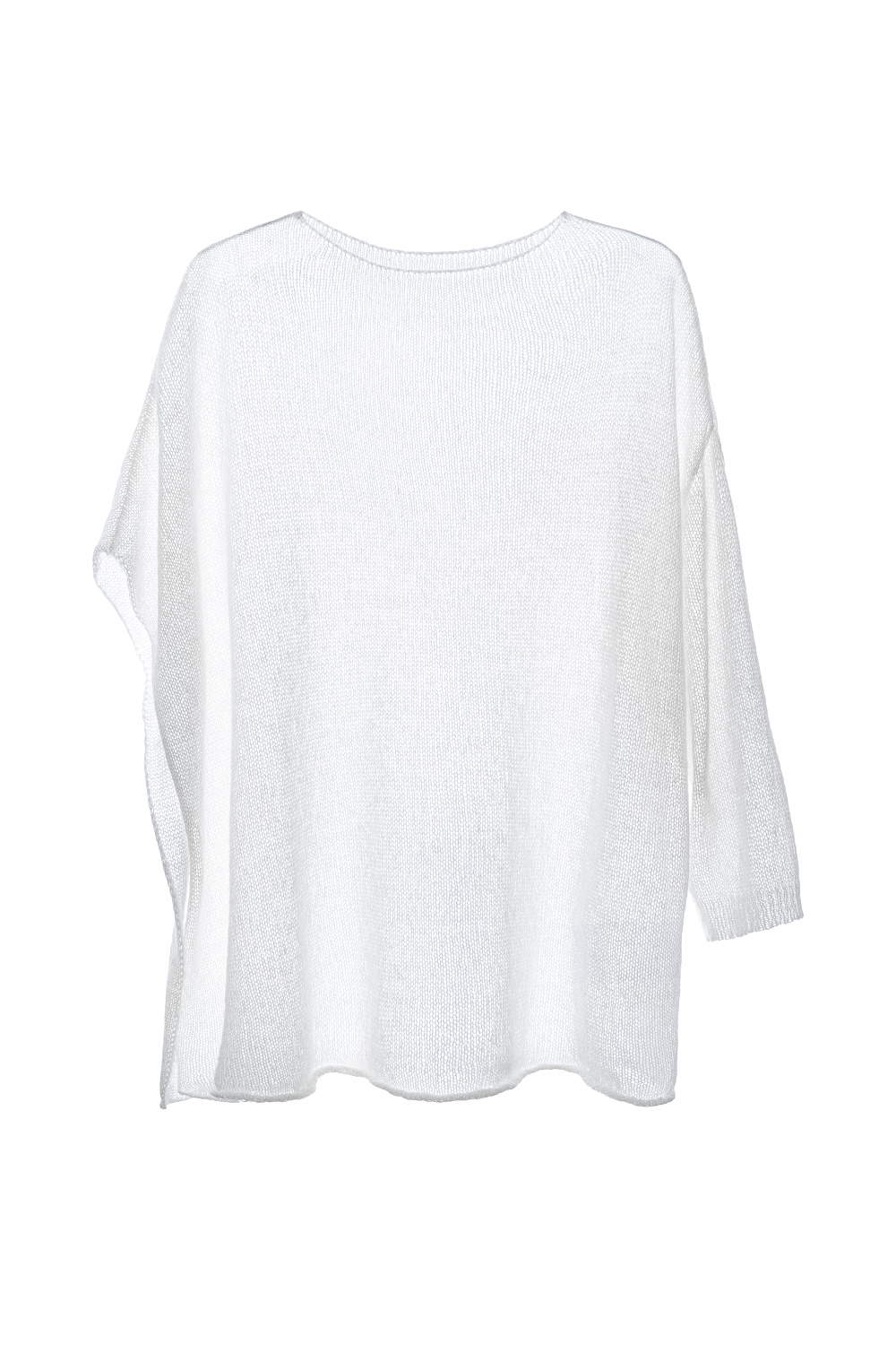 Translucent knitted jumper made of wool with the addition of mohair. Asymmetrical silhouette with one long sleeve and round neckline.