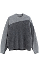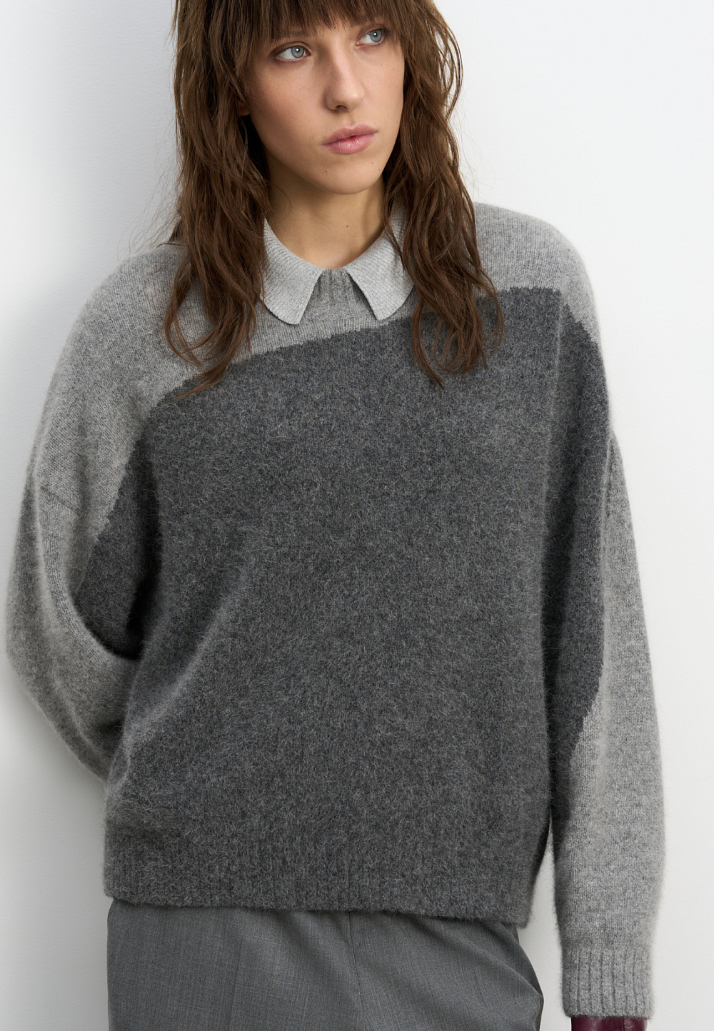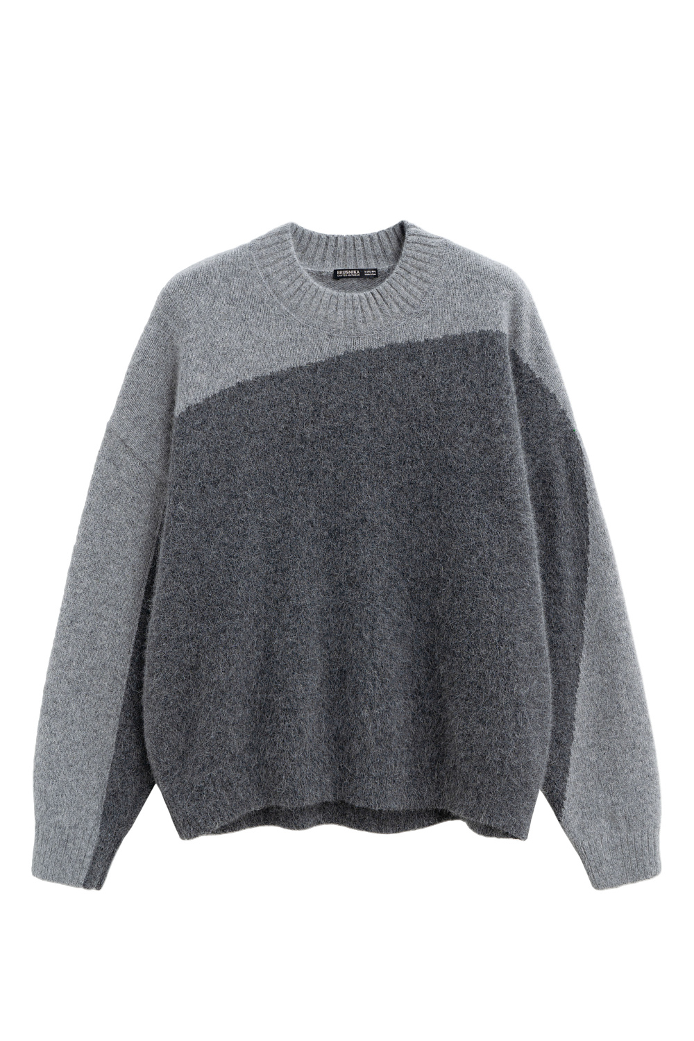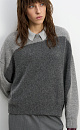 Two-color knitted jumper made of fox down. The model has a loose silhouette, with dropped shoulders and a round neckline. The edges of the product are ribbed.