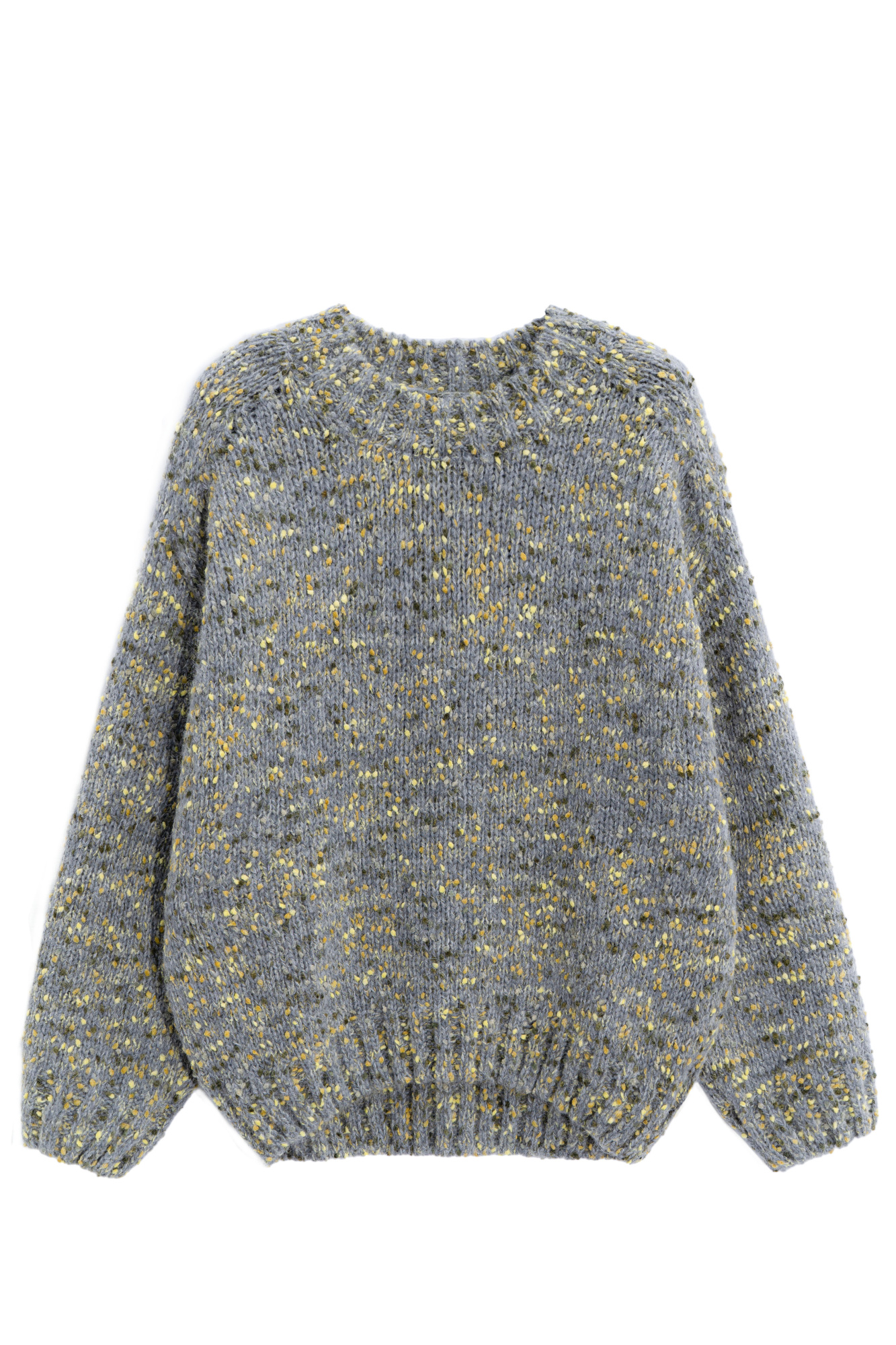 Bouclé alpaca wool jumper. Model of a loose silhouette with epaulette sleeves and a round collar. The bottom of the product, sleeve cuffs and collar are made with a wide rib.