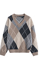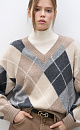 Cashmere knitted jumper with argyle pattern. The model has a loose silhouette, with dropped shoulders and a V-neck. The edges of the product are ribbed.