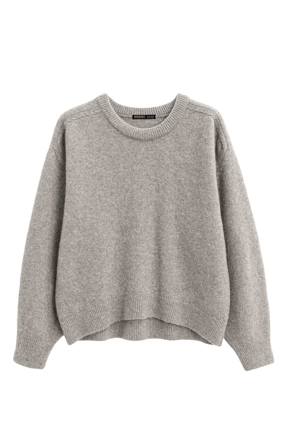 Knitted jumper made of yak wool with the addition of extrafine merino wool. Model of a loose silhouette, with a knitted round neck and raglan sleeves with decorative allowances. The hem and sleeve cuffs are ribbed.