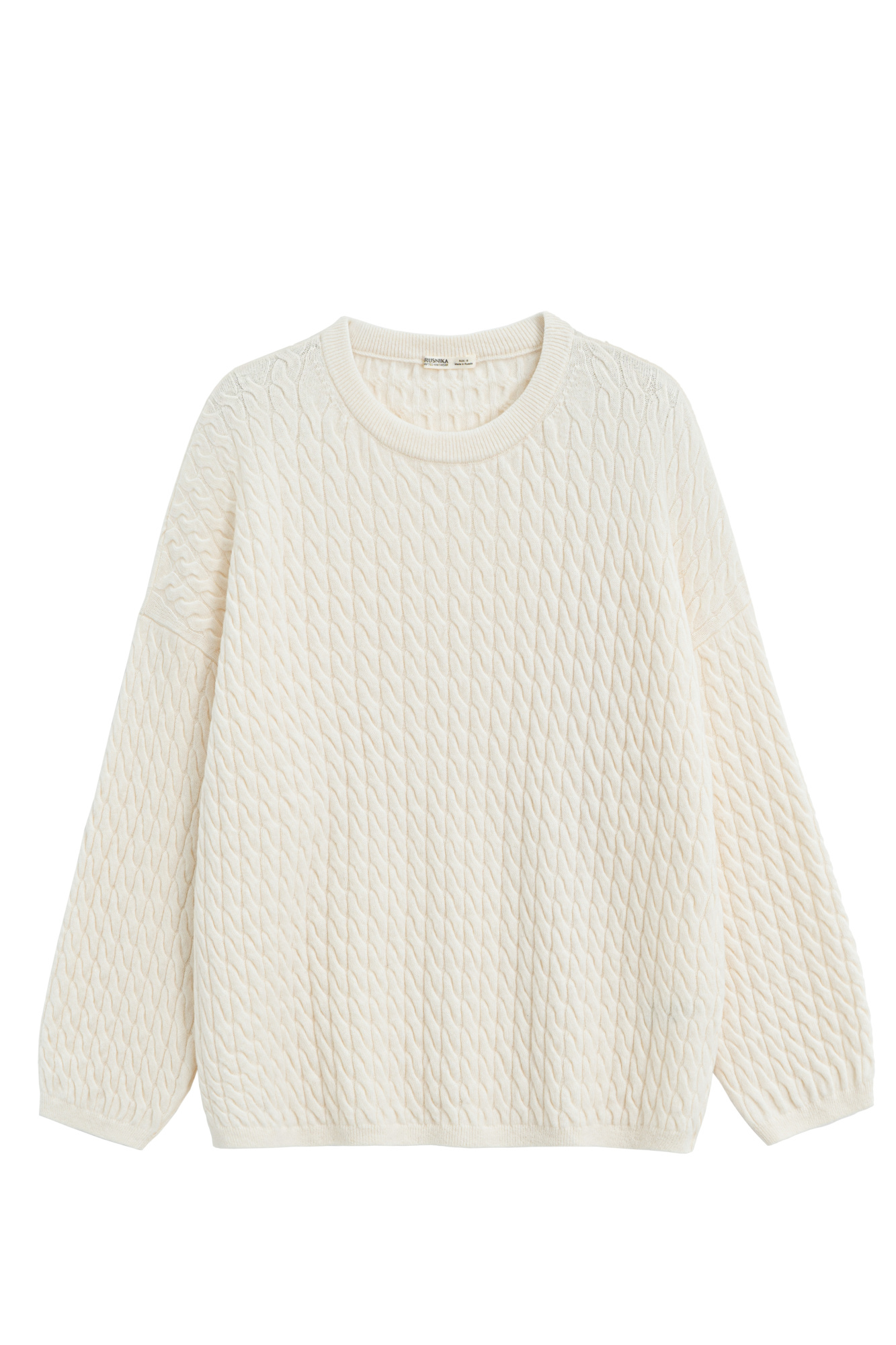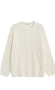 Knitted jumper with voluminous braids made from 100% extrafine merino wool. The model has a loose silhouette, with dropped shoulders and a round neckline decorated with double trim. The edges of the product are made with fine rib.