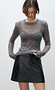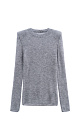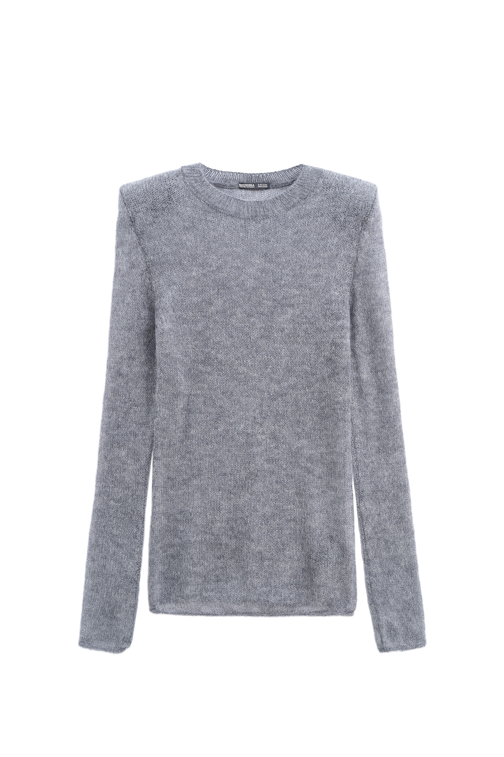 Translucent knitted jumper made of wool with the addition of mohair. Fitted model with a round neckline. Product with shoulder pads.