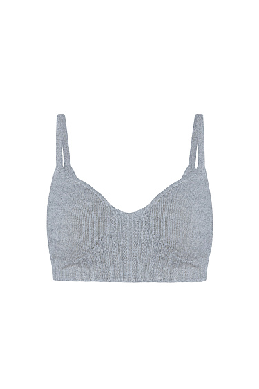 Knitted translucent jumper made of extrafine merino wool and extrafine alpaca. The model has a loose silhouette with dropped shoulders and a V-shaped neckline on the back, decorated with lace.