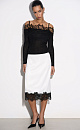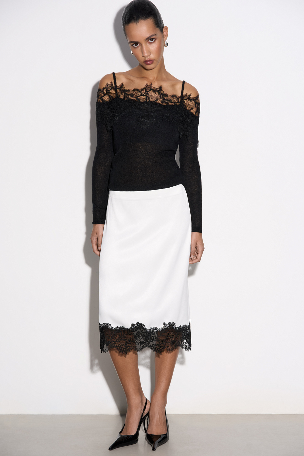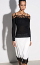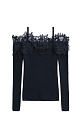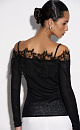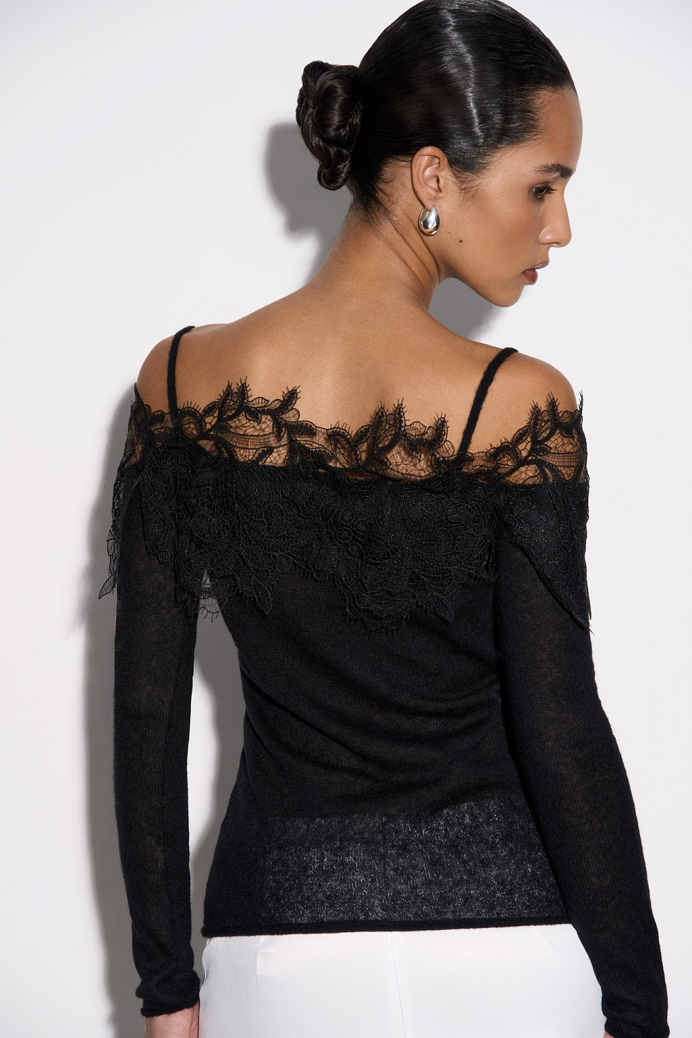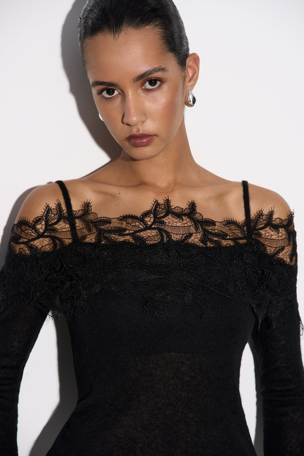 Knitted long sleeve from extrafine merino wool and superfine alpaca. Fitted with thin straps, long sleeves and open shoulders. The neckline is decorated with lace.