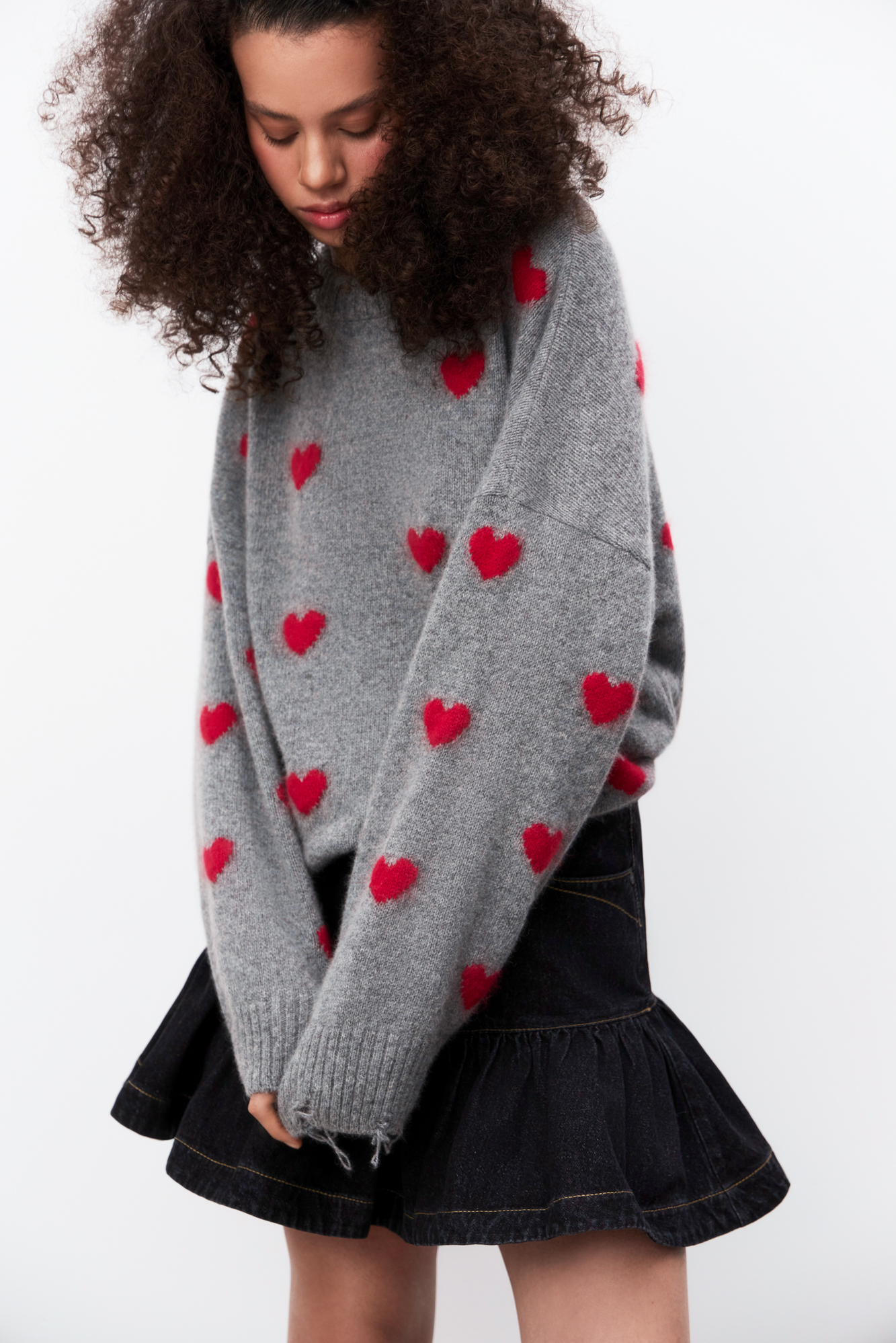 Jumper made of wool and fox down with a jacquard heart pattern. Loose silhouette model with dropped shoulders and a round neckline. The sleeve cuffs and hem are made in a wide rib with slits in a grunge style.