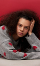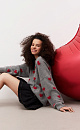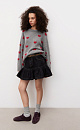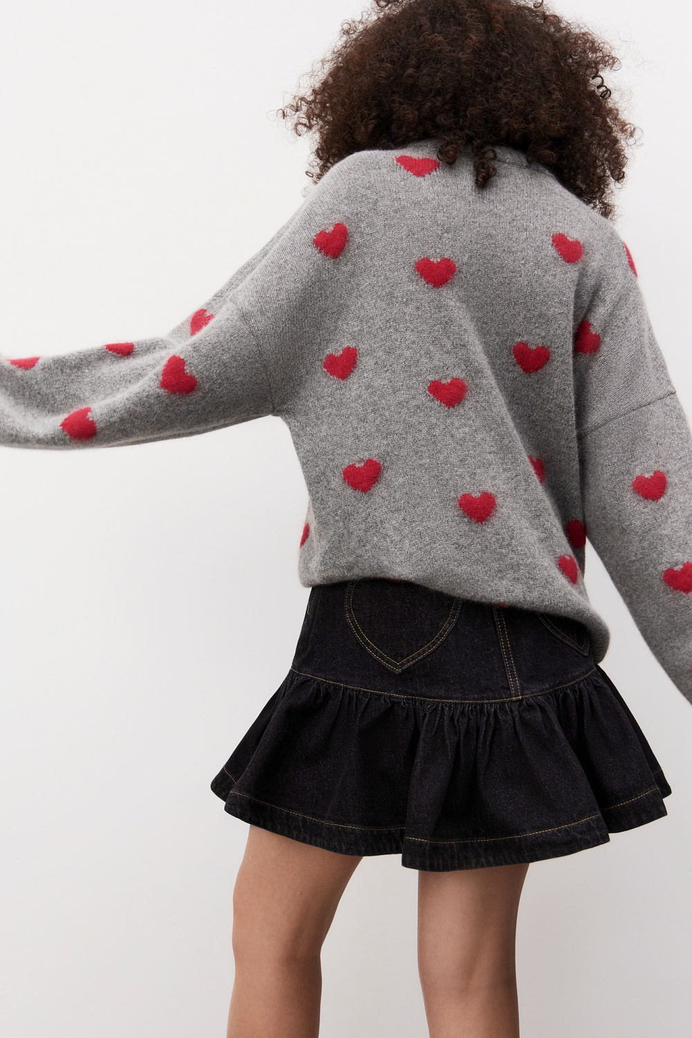 Jumper made of wool and fox down with a jacquard heart pattern. Loose silhouette model with dropped shoulders and a round neckline. The sleeve cuffs and hem are made in a wide rib with slits in a grunge style.