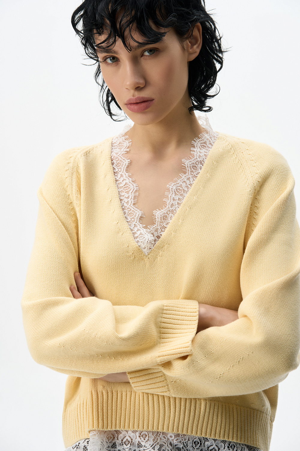 Knitted jumper made of 100% cotton. Loose silhouette model with raglan sleeves and V-neck. The neckline and bottom of the product are decorated with lace in a contrasting color.