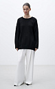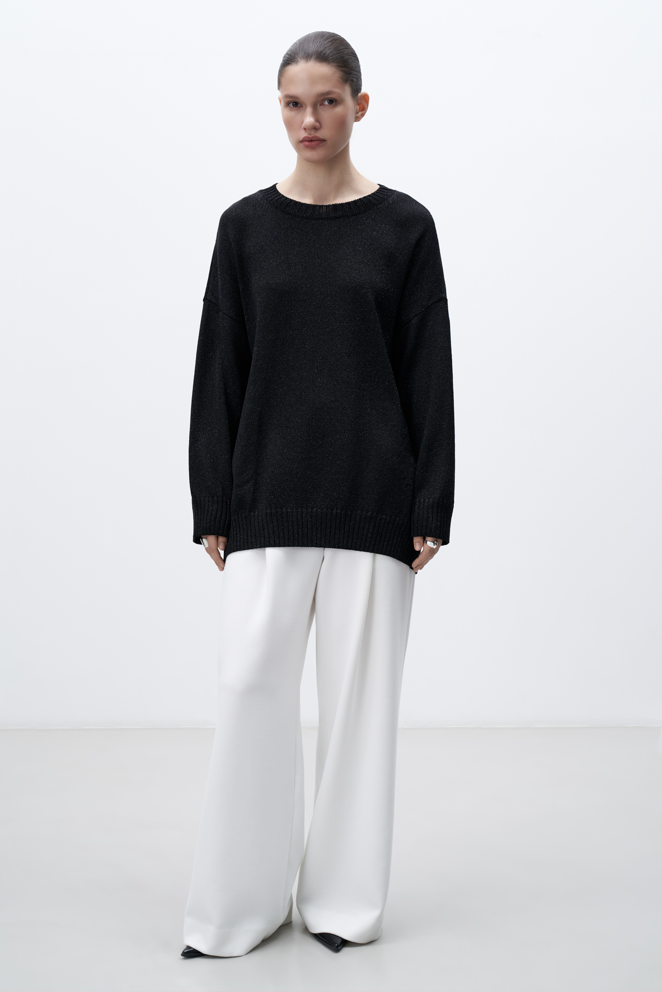 Knitted long jumper made of viscose with lurex. Loose silhouette model with dropped shoulders and a round neckline. The edges of the product are ribbed.