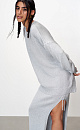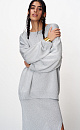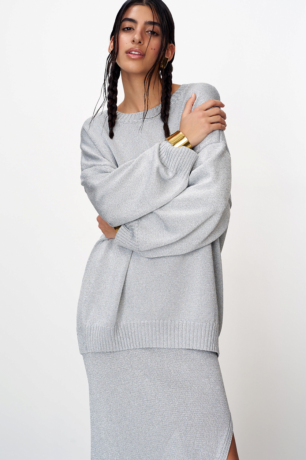 Knitted long jumper made of viscose with lurex. Loose silhouette model with dropped shoulders and a round neckline. The edges of the product are ribbed.
