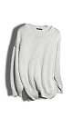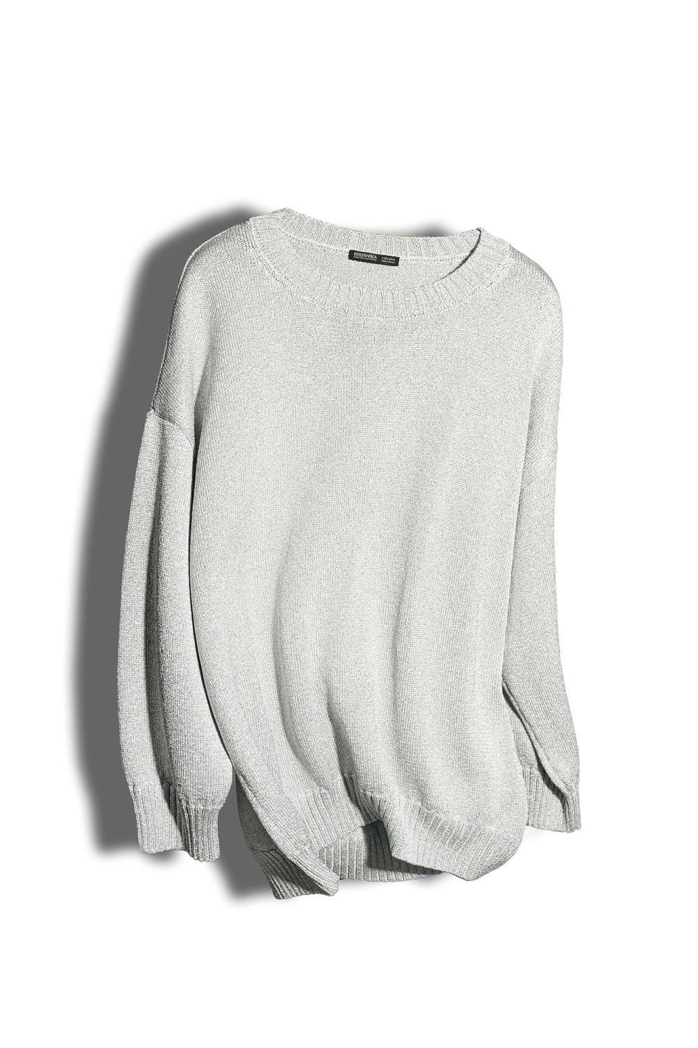 Knitted long jumper made of viscose with lurex. Loose silhouette model with dropped shoulders and a round neckline. The edges of the product are ribbed.