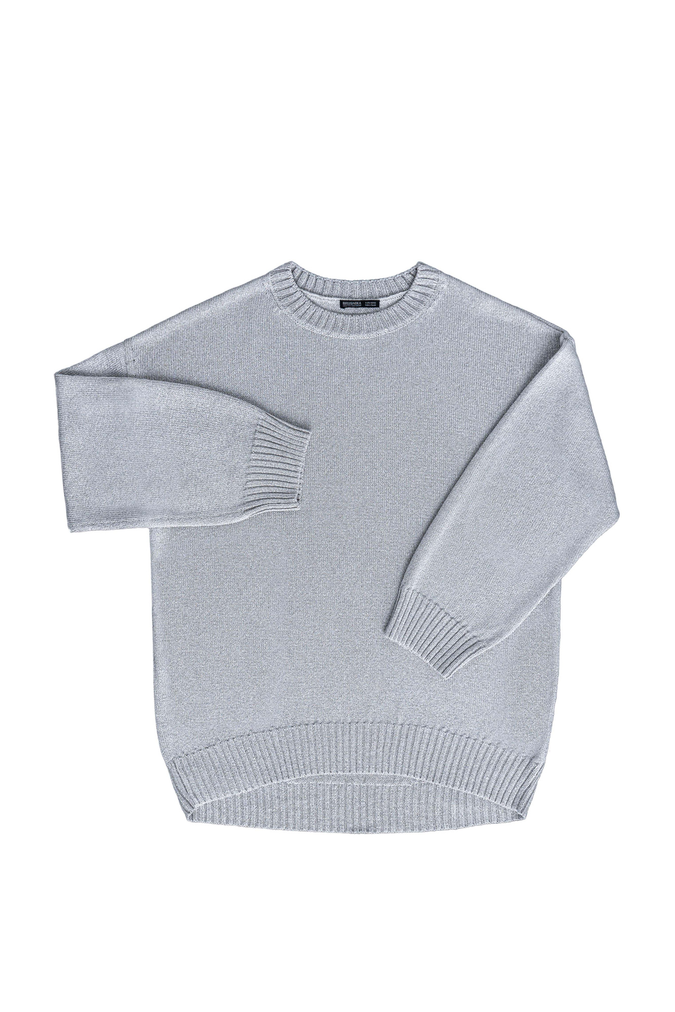 An elongated jumper of a loose silhouette with dropped shoulders and a round neckline, decorated with rib along the edges. The product is made of material with a metallic shine effect.