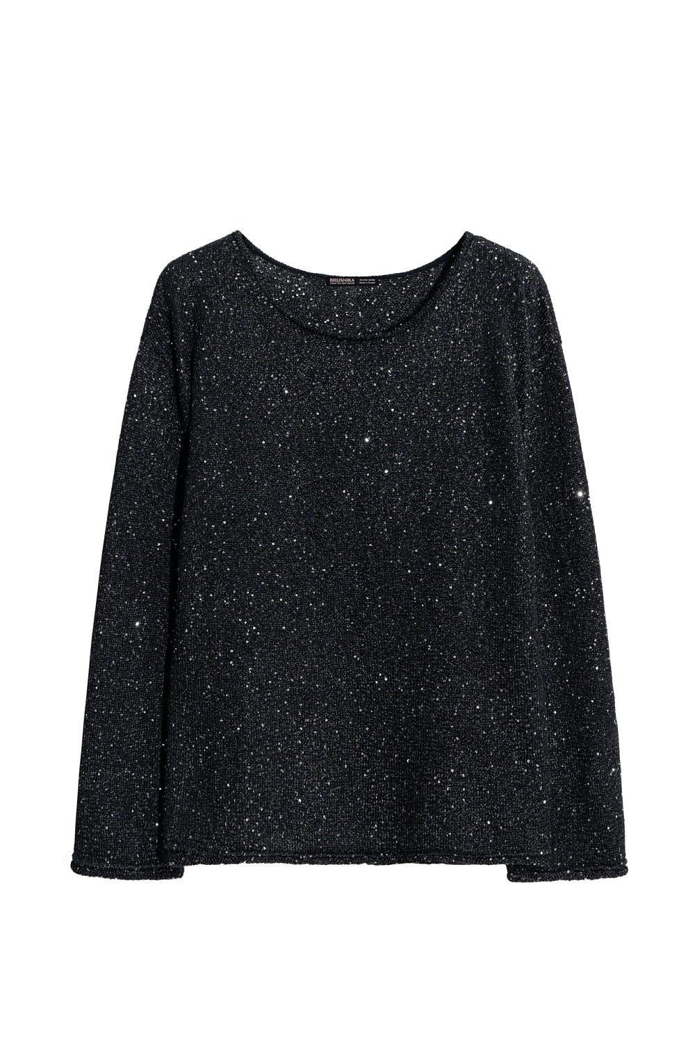 Knitted cotton jumper with sequins and lurex. Loose silhouette model with long sleeves and a round neckline.