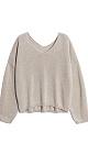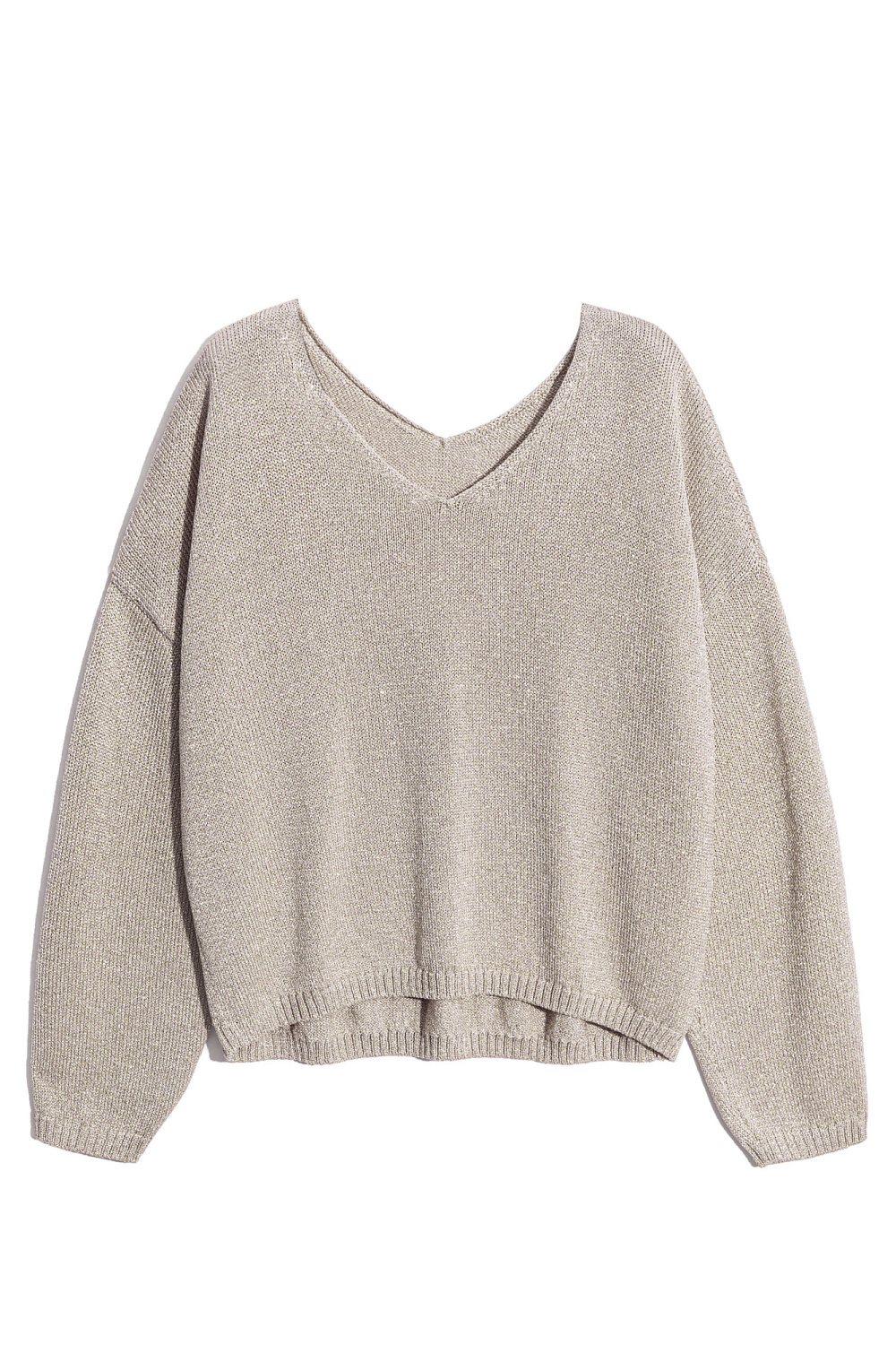 Jumper made of viscose with the addition of lurex. The model has a loose silhouette, with dropped shoulders and a V-neck. The sleeve cuffs and hem are ribbed.