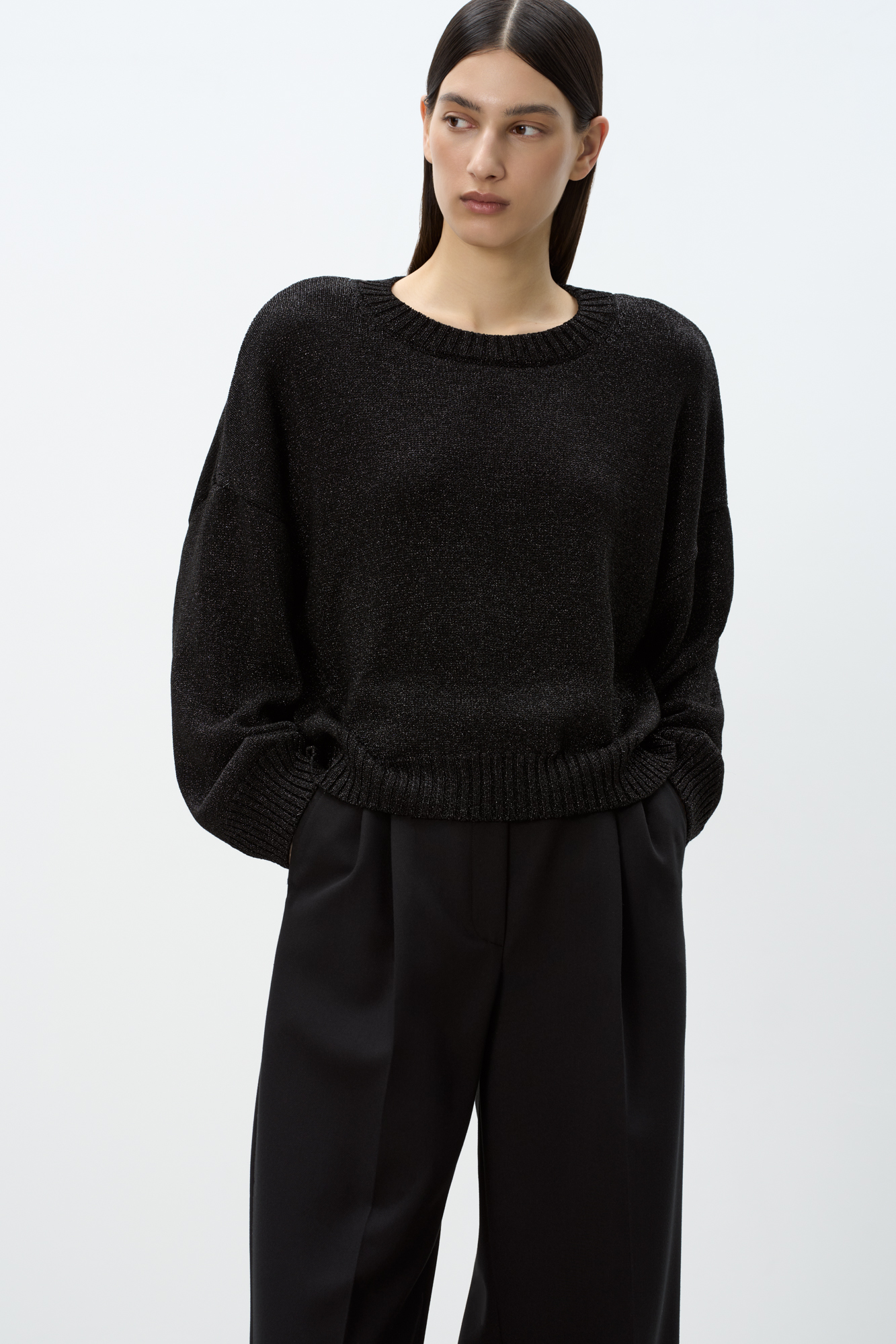 Knitted jumper made of viscose with the addition of lurex. Loose silhouette model with a round neckline and dropped shoulders.
