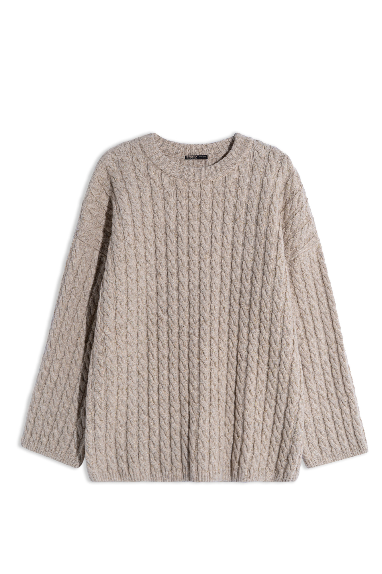 Knitted jumper with voluminous braids made of wool and cashmere with lurex. The model has a loose silhouette, with dropped shoulders and a round neckline. The edges of the product are made with fine rib.