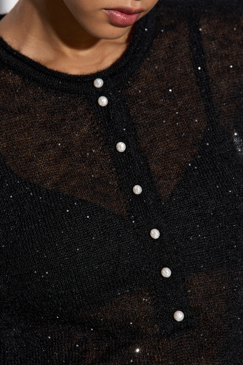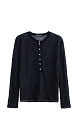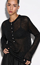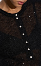 Knitted long-sleeve made of kidmohair, decorated with small sequins. Model with a round neckline with a button placket. The edges of the product are decorated with a roller.