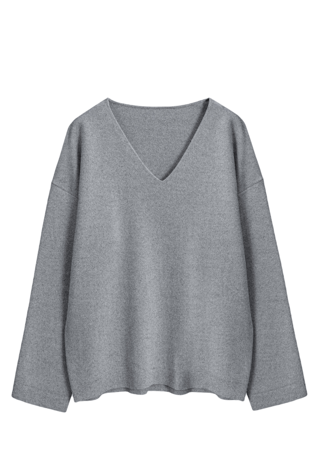 Knitted jumper made of wool with the addition of cashmere. The model has a loose silhouette with dropped shoulders and a V-shaped neckline. The sleeve cuffs and hem are ribbed.