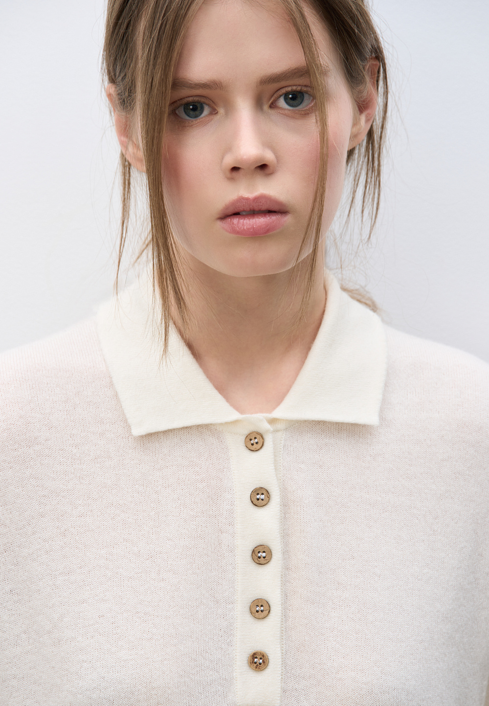 Knitted jumper made of cashmere and wool. Straight silhouette with dropped shoulders and a polo collar with buttons. The sleeve cuffs and hem are ribbed.