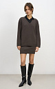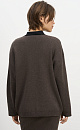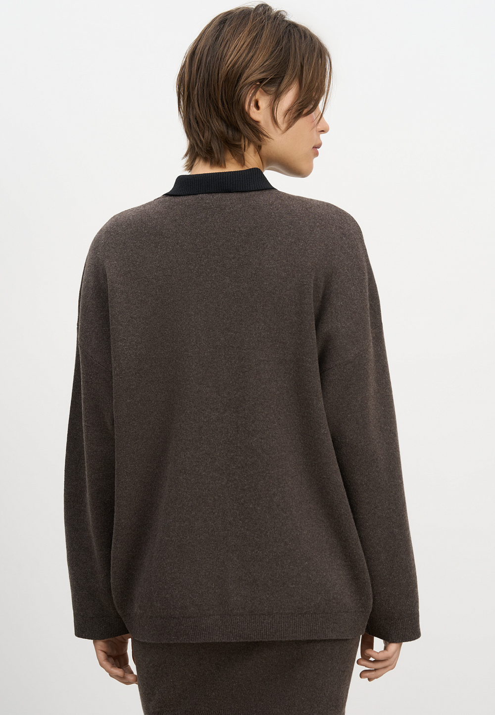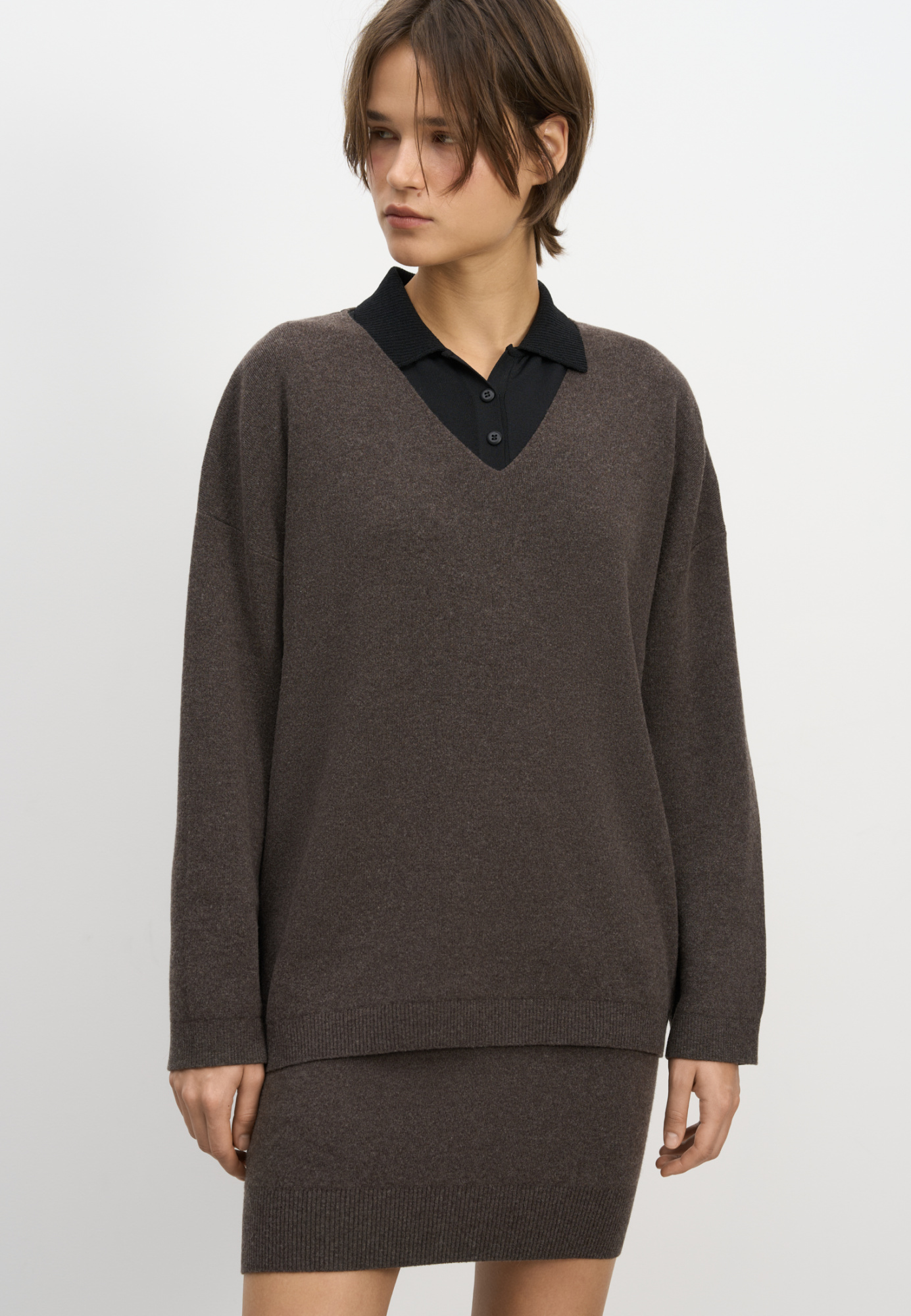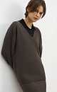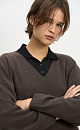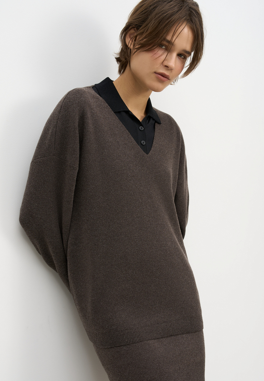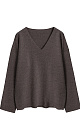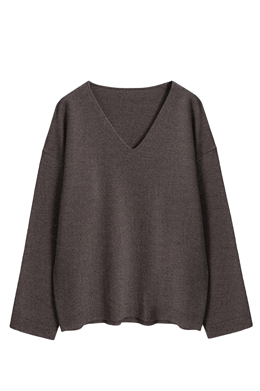 Knitted jumper made of wool with the addition of cashmere. The model has a loose silhouette with dropped shoulders and a V-shaped neckline. The sleeve cuffs and hem are ribbed.